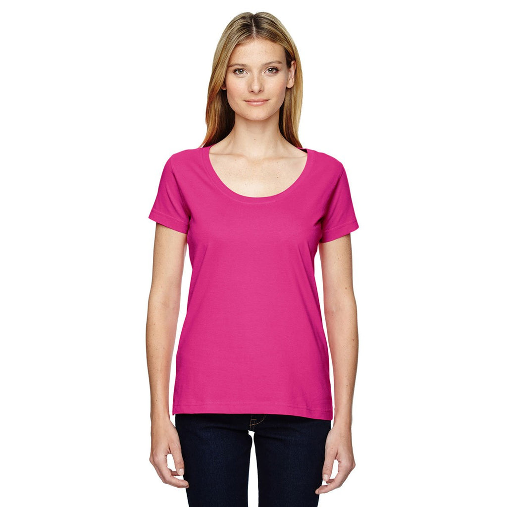 This LAT Women's Hot Pink Scoop Neck Fine Jersey T-Shirt is the perfect canvas for your company's custom logo. The design of this t-shirt features a taped neck with a topstitch ribbed surface, providing all-over comfort on any occasion. The cotton heather thread adds a soft surface that resists moisture well. This shirt is both comfortable and flattering, making it the perfect choice for a company giveaway. Combined with your custom logo, this shirt works well at recruiting events and can also be suitable for a company athletic event if desired.