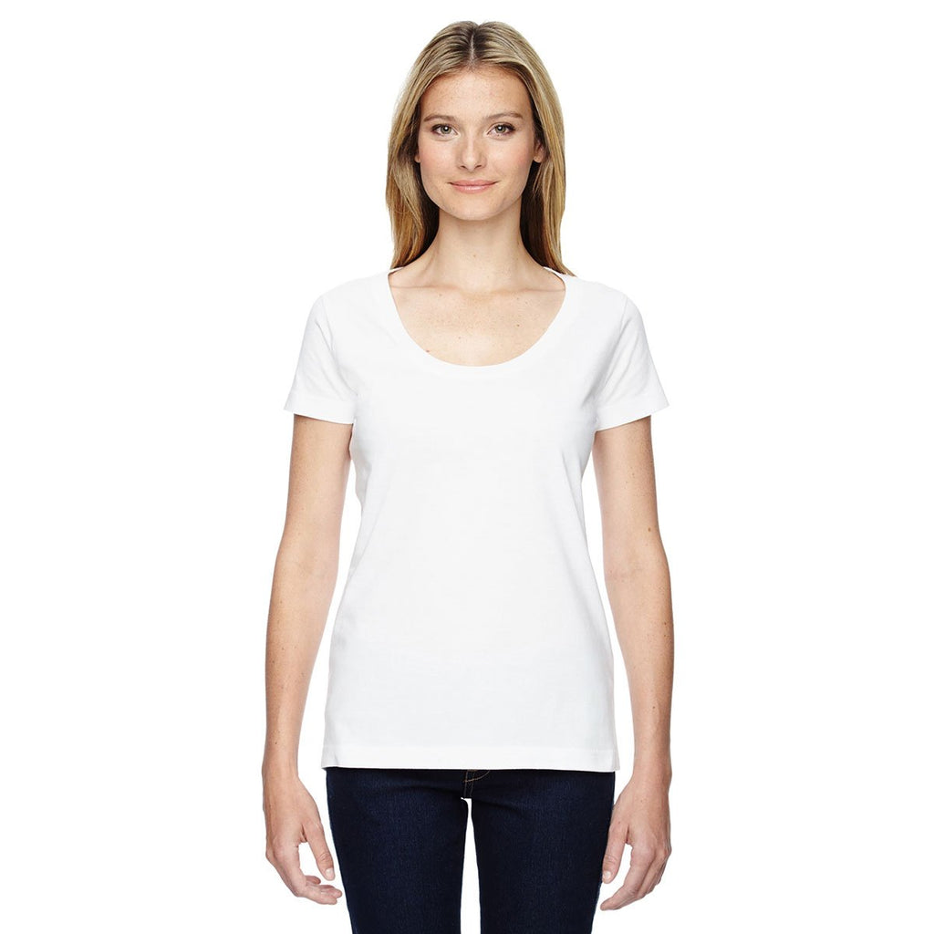 This LAT Women's White Scoop Neck Fine Jersey T-Shirt is the perfect canvas for your company's custom logo. The design of this t-shirt features a taped neck with a topstitch ribbed surface, providing all-over comfort on any occasion. The cotton heather thread adds a soft surface that resists moisture well. This shirt is both comfortable and flattering, making it the perfect choice for a company giveaway. Combined with your custom logo, this shirt works well at recruiting events and can also be suitable for a company athletic event if desired.Highlights