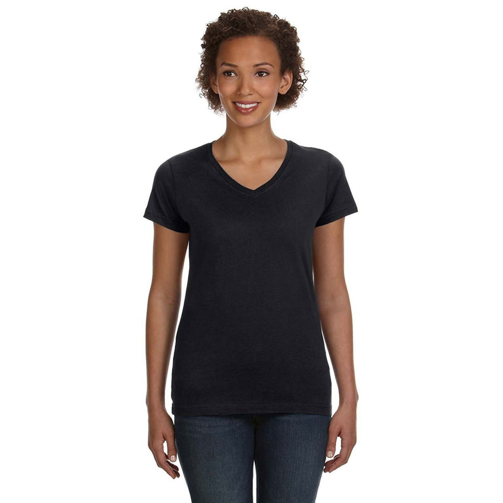 The cotton ringspun layout of this LAT Women's Black V-Neck Fine Jersey T-Shirt is the perfect canvas for your company's custom logo. The fine curve on the shirt is both flattering and stylish. The V-neck layout provides a modern feel with a topstitched and ribbed design. Combined with your custom logo, this shirt is the perfect choice for a company giveaway. It also works well at casual recruiting events and can be suitable for a company athletic event if desired.Highlights