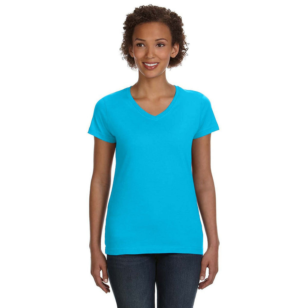 The cotton ringspun layout of this LAT Women's Aqua V-Neck Fine Jersey T-Shirt is the perfect canvas for your company's custom logo. The fine curve on the shirt is both flattering and stylish. The V-neck layout provides a modern feel with a topstitched and ribbed design. Combined with your custom logo, this shirt is the perfect choice for a company giveaway. It also works well at casual recruiting events and can be suitable for a company athletic event if desired.Highlights