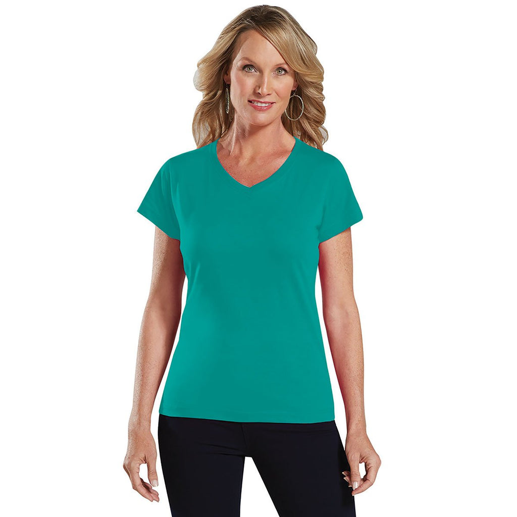 The cotton ringspun layout of this LAT Women's Jade V-Neck Fine Jersey T-Shirt is the perfect canvas for your company's custom logo. The fine curve on the shirt is both flattering and stylish. The V-neck layout provides a modern feel with a topstitched and ribbed design. Combined with your custom logo, this shirt is the perfect choice for a company giveaway. It also works well at casual recruiting events and can be suitable for a company athletic event if desired.Highlights