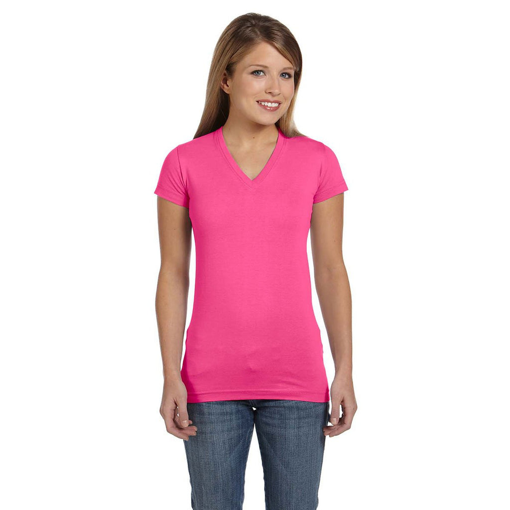 The cotton ringspun layout of this LAT Women's Hot Pink Junior Fit V-Neck Fine Jersey T-Shirt is the perfect canvas for your company's custom logo. The fine curve on the shirt is flattering and provides a youthful feel. The V-neck layout adds a modern touch with a topstitched and ribbed design. Combined with your custom logo, this shirt is the perfect choice for a company giveaway. It also works well at casual recruiting events and can be suitable for a company athletic event if desired.Highlights