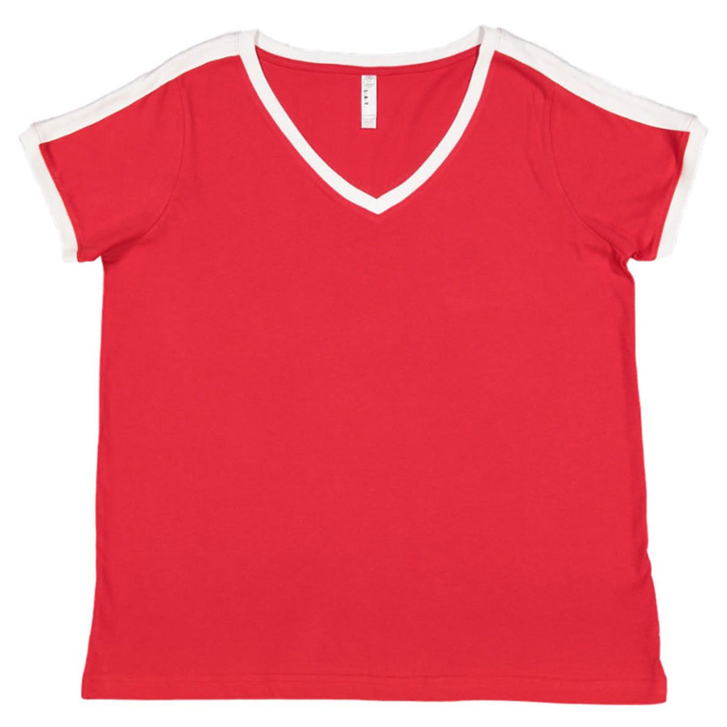 With the addition of your company's custom logo, your female employees will love this LAT Women's Red/White Curvy Soccer Ringer Premium T-Shirt, thanks to its fashionable athletic design. The V-neck collar features a separate color. The sleeves have a small color accent on the top to make the layout more distinct. The two-tone design of this jersey t-shirt is both sporty and flattering. This custom soccer ringer shirt is the perfect uniform if your company is involved in a corporate athletic league. Combined with your custom logo, this shirt also works as a marketing tool outside of the office.Corresponding Men's Style: LAT Men's Red/White Soccer Ringer Fine Jersey T-Shirt