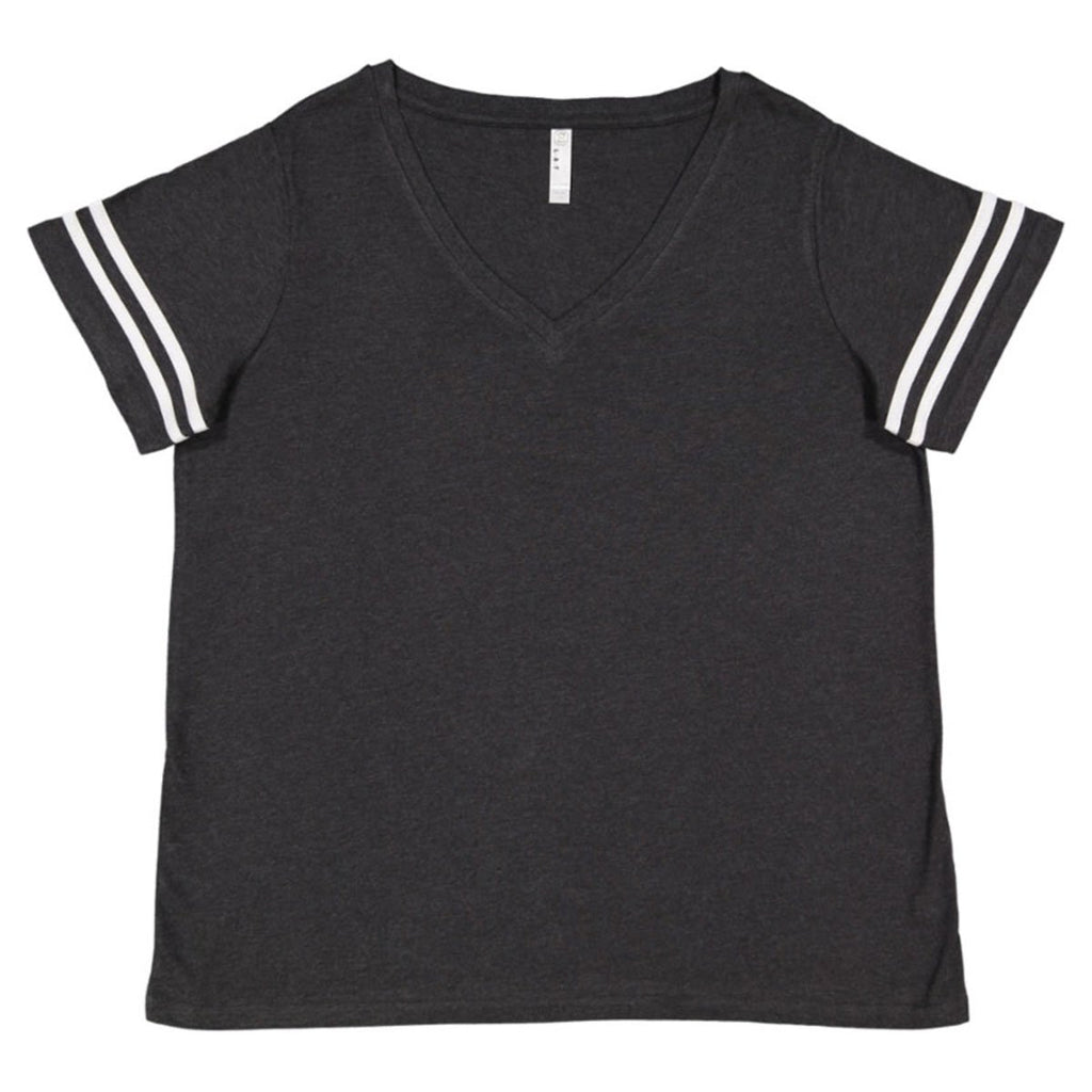 With the addition of your company's custom logo, see how well this LAT Women's Vintage Smoke/Blended White Curvy Football Premium Jersey T-Shirt works for your promotional plans. This shirt comes in an assortment of colors with a series of small stripes found on the sleeves. These added stripes feature a cotton and polyester mix to produce a comfortable surface that looks unique and sporty. With your brand's custom logo, this shirt is the ideal choice for any company athletic league or recreational event.