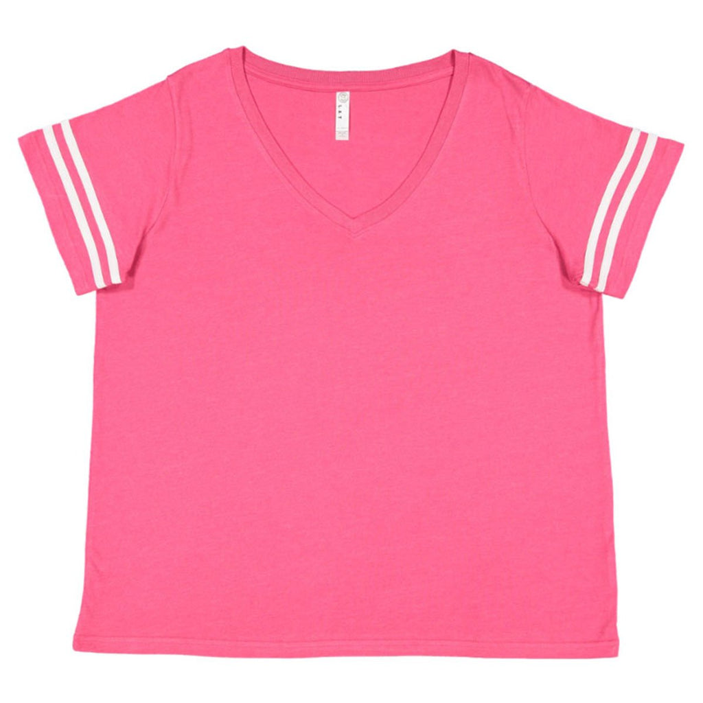 With the addition of your company's custom logo, see how well this LAT Women's Vintage Heather Pink/Blended White Curvy Football Premium Jersey T-Shirt works for your promotional plans. This shirt comes in an assortment of colors with a series of small stripes found on the sleeves. These added stripes feature a cotton and polyester mix to produce a comfortable surface that looks unique and sporty. With your brand's custom logo, this shirt is the ideal choice for any company athletic league or recreational event.