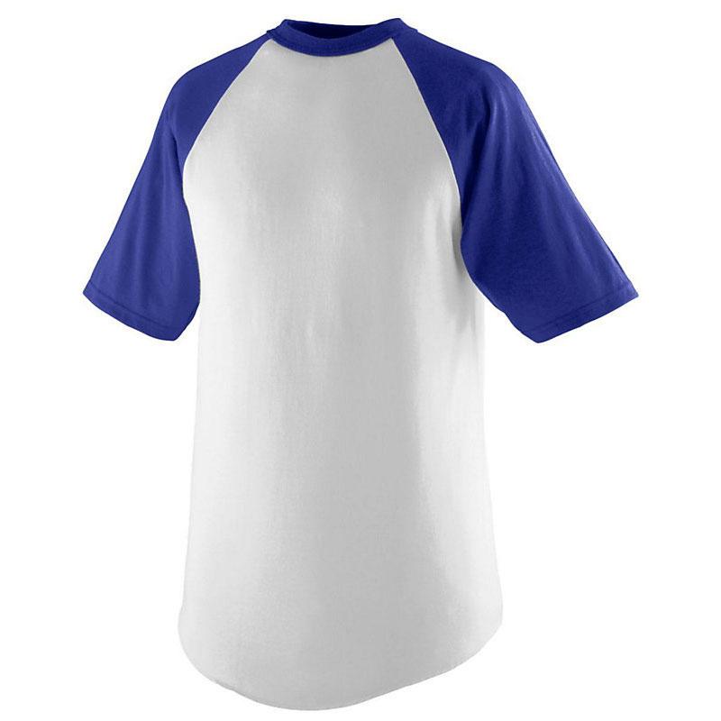 Attach your company logo to Augusta Sportswear Men's White/Purple Short-Sleeve Baseball Jersey for a stylish shirt, perfect for a day at the park or as employee apparel for the company softball team. Available in 16 different colors, choose the right color tone to match your company logo. Features of this must-have clothing item include a comfortable 50/50 cotton/polyester jersey knit fabric, contrasting color sleeves, double-needle hem sleeves, and fishtail bottom. Purchase this shirt as corporate apparel and add your screen print company logo to the front of the shirt for the perfect finishing touch.Highlights