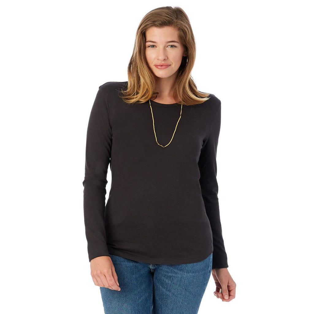 Order the company logoed Alternative Women's Black Keepsake Long-Sleeve to present a vintage uniform for the members of your corporate women's softball team. Rugged polyester resists the types of rips and tears that occur during slides into second base and lay outs for line drives in the field. Smooth cotton delivers comfort throughout a weekend tournament. Tonal stitching inside of the collar complements the chic appearance of the blind stitched curved hem. Wear the multiple purpose long sleeve shirt after the game to your favorite watering hole to celebrate a victory. Attach a custom logo on the large imprint area to let everyone know your company offers high quality products.Corresponding Men's Style: Alternative Men's Black Keeper Long-Sleeve