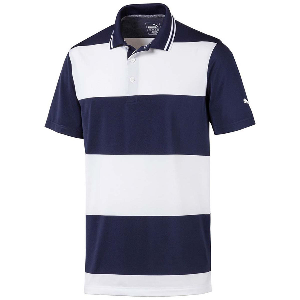 As the name Puma Golf Men's Bright White/Peacoat Rugby Polo implies this is a golf shirt from Puma designed with classic rugby stripes ideal for your custom logo. Offered in bright white/peacoat, dazzling blue/peacoat, and peacoat/rhubarb color combinations this short sleeve golf shirt would be a great option for employee apparel and recruiting events.Highlights