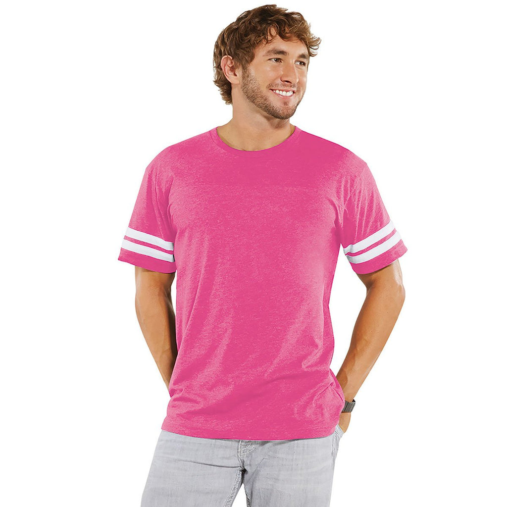 With the addition of their custom logo, businesses with a sporty streak will find the LAT Men's Vintage Heather Pink/Blended White Football Fine Jersey T-Shirt to be an intriguing choice for a company uniform. The two stripes on the sleeves are made with a viscose material that adds a sporty look and will make your logo memorable. See how well the hem sleeves are laid out while the bottom adds a comfortable surface for a man to wear. Combined with your custom branding, this shirt is the perfect choice for company athletic leagues or recreational events. It also works well at casual recruiting events or as company giveaways.