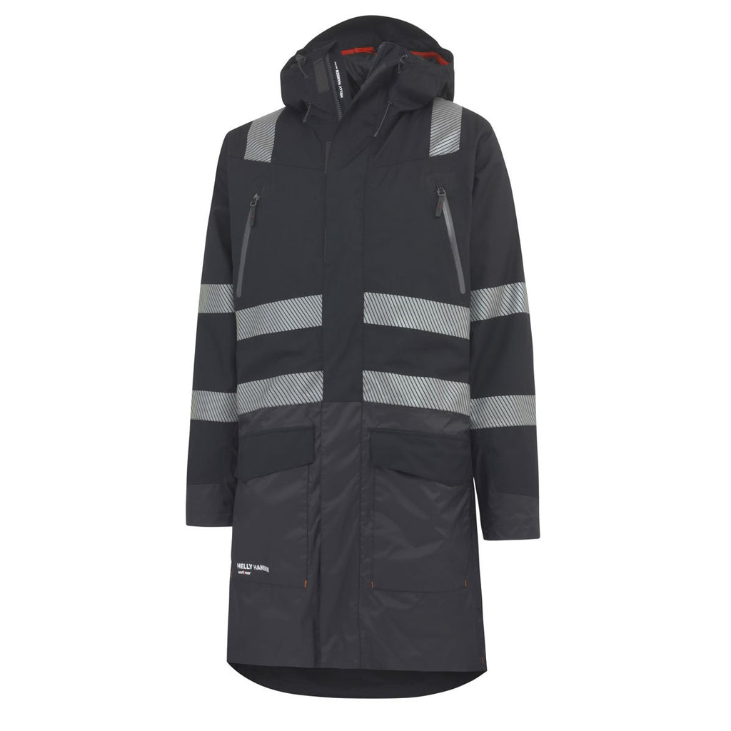 The logoed Helly Hansen Men's Black/Charcoal Oslo H2 Flow CIS Coat offers warmth and security features to keep your employees safe and comfortable in their daily job duties. Features you'll find with this corporate apparel item include extended length for extra coverage, zippered chest pockets, two hand pockets, hidden zipper, and reflective detailing. Add a company logo embroidery to the front of the jacket and you have an exceptional employee apparel item to add to the work wardrobe.