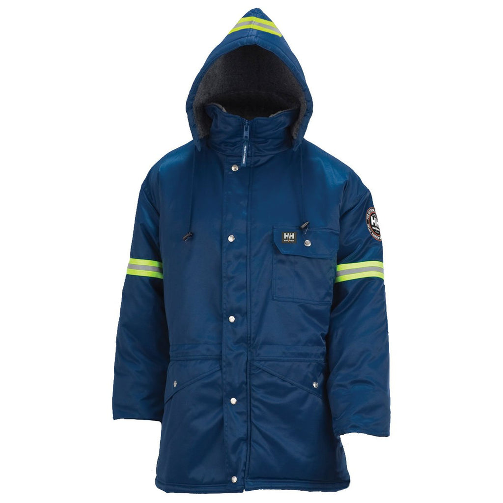 The custom Helly Hansen Men's Navy Thomson Parka offers warmth and safety features for your employees to enjoy as they take part in their daily work duties outdoors. Some of the aspects your hardworking staff members will appreciate include a cozy interior fabric, attached hood, chin coverage, snap and zipper front, snap pockets, and reflective detailing. Add a corporate logo to the front of the jacket and you have the perfect corporate apparel item for your workers to wear.