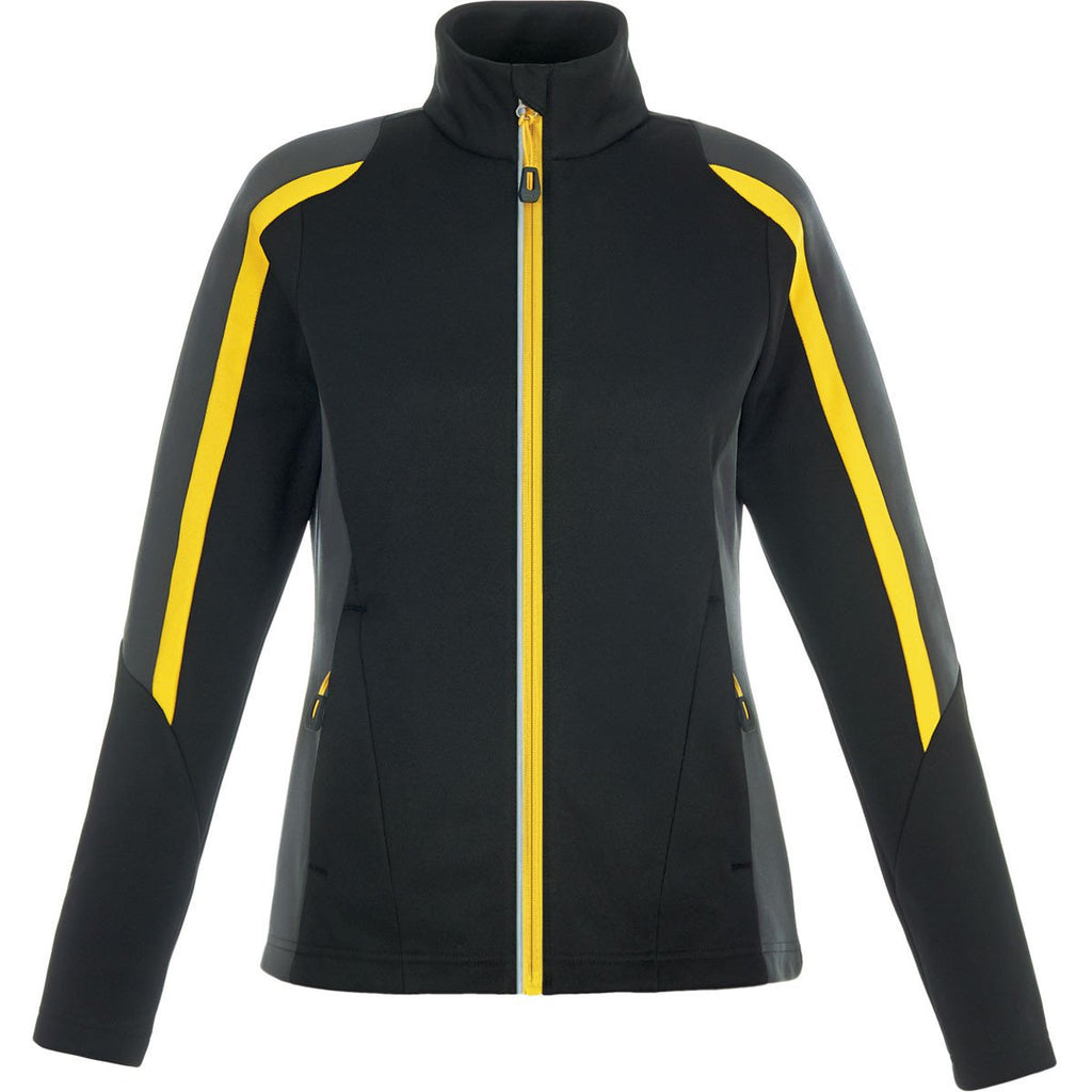 North End Women's Black/Campus Gold Strike Colorblock Fleece Jacket allow you to access an audio port via the inside left pocket. The lower pockets that include contrast reverse coil zippers allow you to carry electronic devices on you, whenever you pedal down a bike trail or take a brisk walk in the park. Moisture wicking polyester brushed back fleece ensures you remain comfortable during the most intense sporting competitions. The reflective print on the back of North End Women's Black Compass Gold Strike Colorblock Fleece Jacket alerts drivers of your presence along busy roads. Attach a company logo to increase your company's exposure.Corresponding Men's Style: North End Men's Black/Campus Gold Strike Colorblock Fleece Jacket