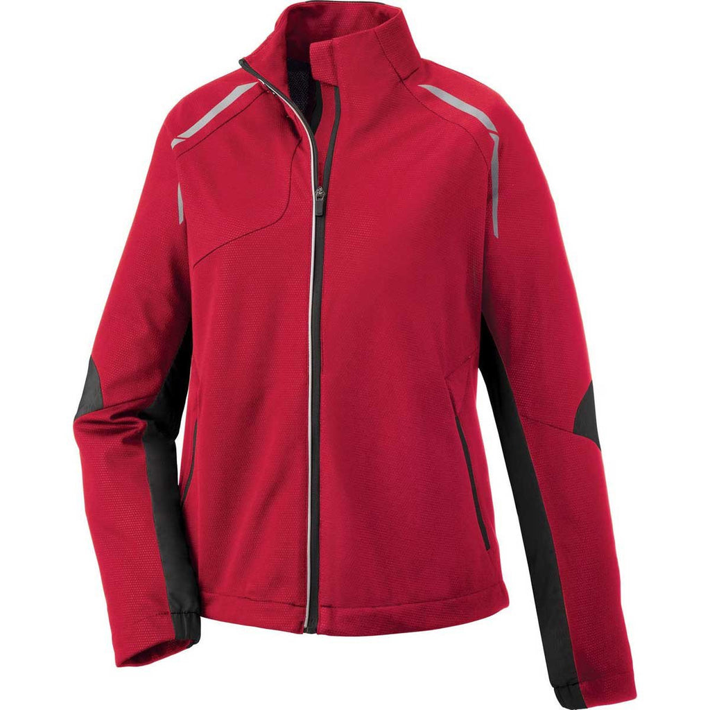 With a water resistant finish, the North End Women's Olympic Red Dynamo Performance Hybrid Jacket keeps you dry and warm on chilly days. The 100% polyester jacket ensures rigorous use outdoors, from arduous treks through the backcountry to performing home improvement jobs. Lower the fold down collar when the weather warms up and raise it when the night chill becomes too much to bear. The adjustable shock cord located at the back hem provides you with easy access to the front pockets. This stylish jacket includes a large area to add a custom logo that promotes your company.Corresponding Men's Style: North End Men's Olympic Red Lightweight Bonded Performance Hybrid Jacket