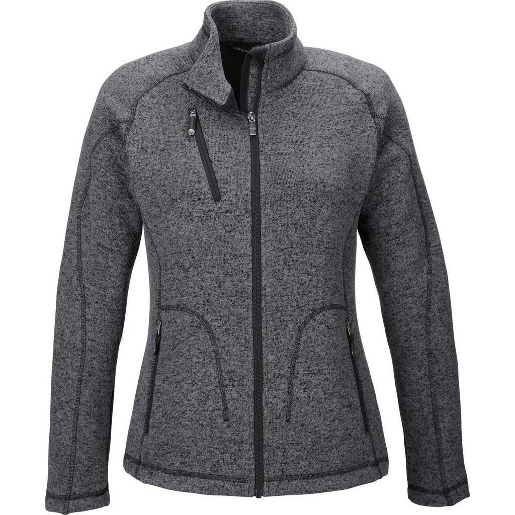 One-hundred percent polyester sweater knit fleece makes the North End Women's Heather Charcoal Peak Jacket the perfect outer garment during the spring and fall. The taut knit fleece feels like you're wearing a sweater, but pure polyester proves this outer layer represents a highly durable jacket. Contrast cover stitch detailing gives the jacket more of an upscale look, without going over the fashion top. The brushed tricot-lined chest pocket offers you instant access to important personal possessions. Attach a custom logo on the chest to increase brand awareness during professional networking events.Corresponding Men's Style: North End Men's Heather Charcoal Peak Sweater Fleece Jacket