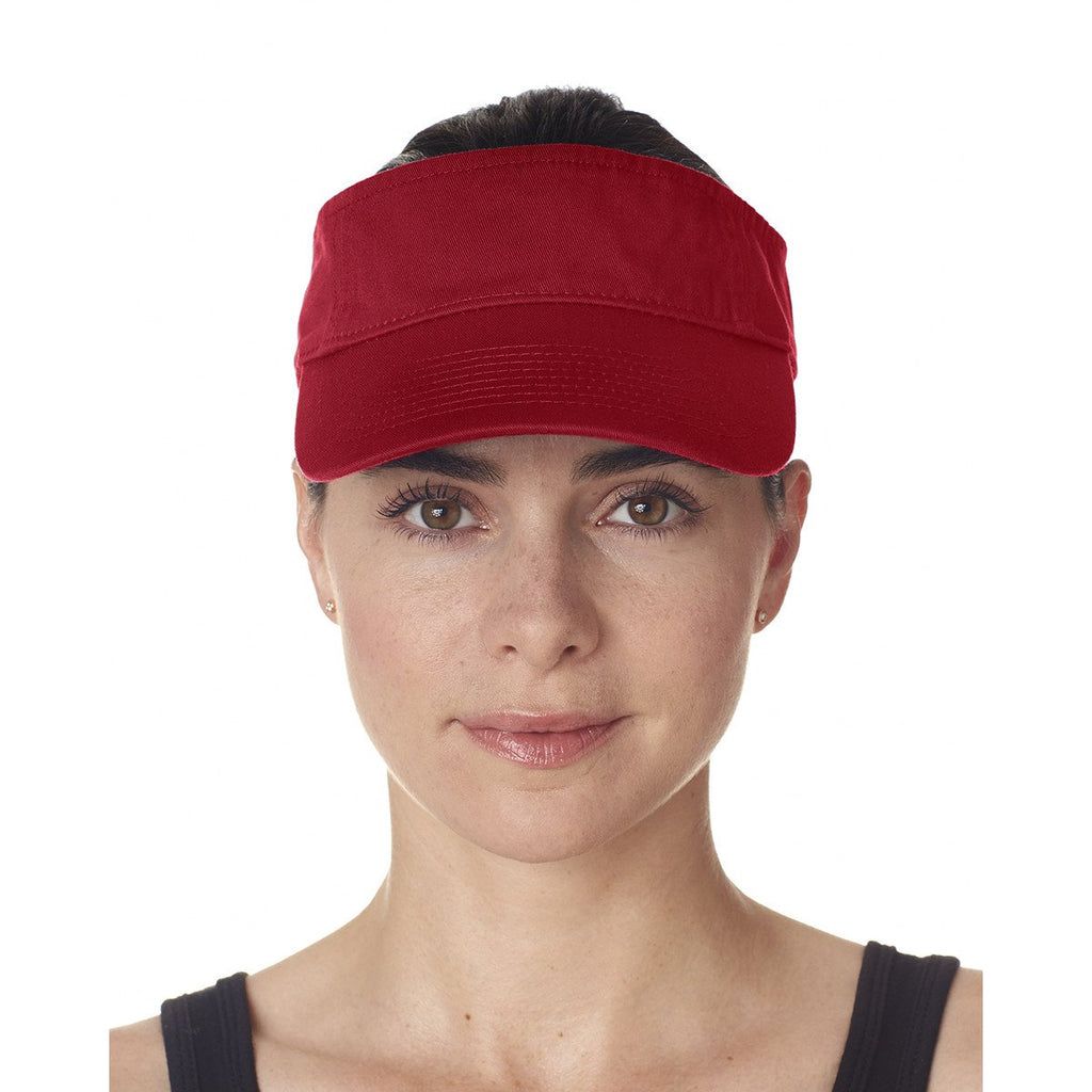 Wear the versatile UltraClub Women's Red Classic Cut Chino Cotton Twill Visor for all the sports you play. The long bill provides protection against the sun during corporate softball games. On sweltering days at your favorite golf course, the open top circulates air to keep your head comfortably cool. One-hundred percent washed cotton endures daily use to give you years of high performance headwear. The pre-curved visor allows you to let as much of the sun as you want to hit your face. Matching self-adhesive closure ensures you enjoy a snug fit throughout every softball game. Add your corporate logo to increase awareness of your company at outdoor recreational events.Highlights