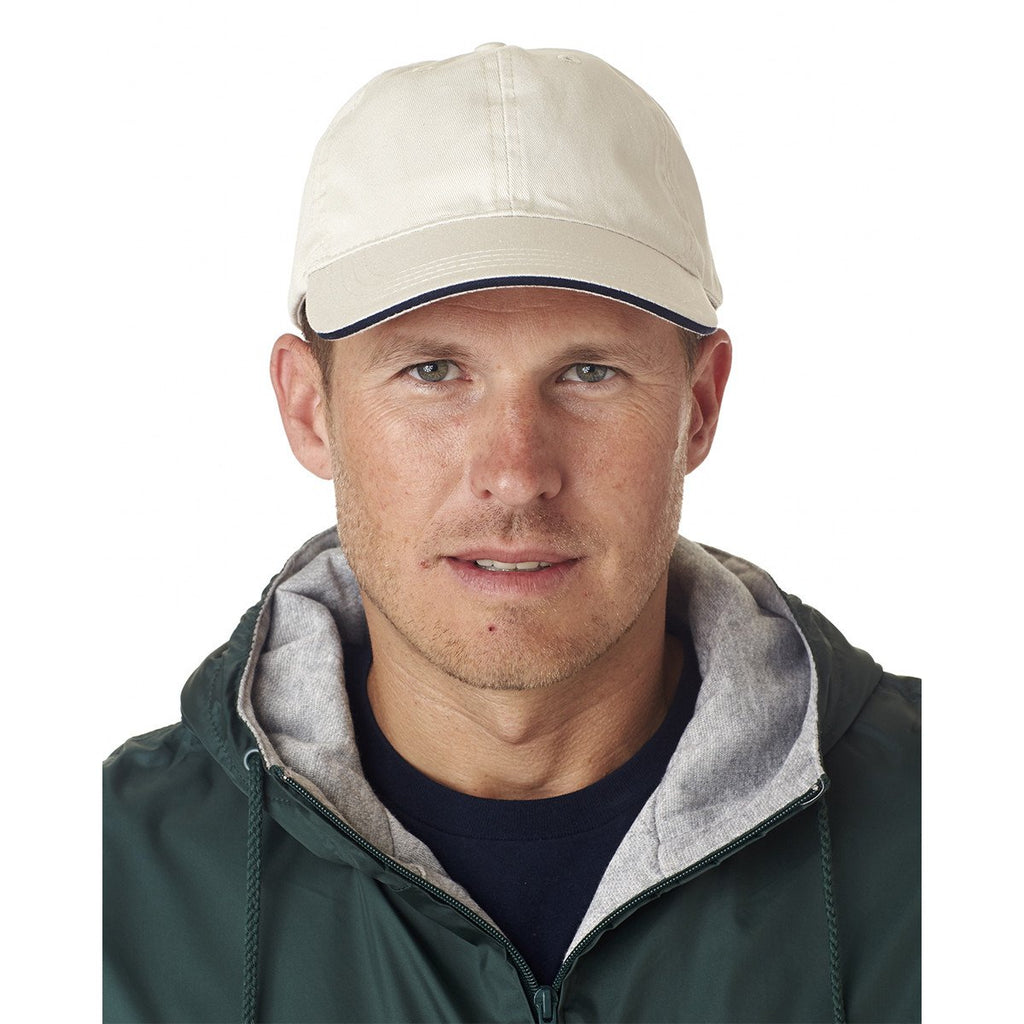 UltraClub Men's Stone/Navy Classic Cut Chino Cotton Twill Unstructured Sandwich Cap