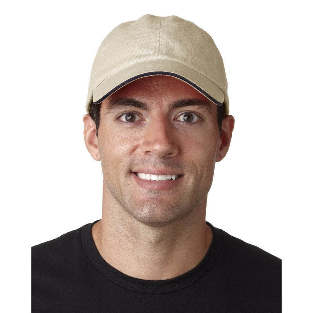Generate buzz for your company by attaching a custom logo to the UltraClub Men's Stone/Navy Classic Cut Brushed Cotton Twill Unstructured Sandwich Cap. Order dozens of the high end caps to hand out to loyal customers. Your company receives publicity at civic events, as well as business seminars and conferences. Triple stitching on the sweatband prevents the fabric from ripping or tearing, One-hundred percent cotton creates a smooth feel around the head. Six panels inserted within the cap provide support for the cotton. The low-profile cap includes a pre-curved visor that you manipulate to produce your preferred vision range.Highlights