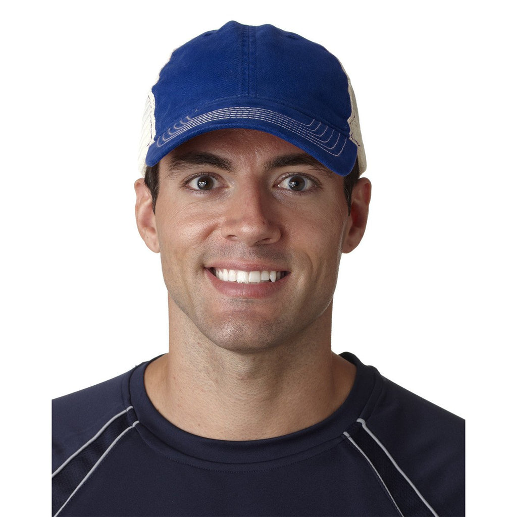 With a polyester mesh back, the UltraClub Men's Royal/Stone Classic Cut Brushed Cotton Twill Unstructured Trucker Cap allows air to circulate and enhance your comfort during steamy hot summer days. The invigorating feeling of a dry, cool head gives you an advantage over the other softball team. Super soft 100% cotton never succumbs to the rigors of frequent use. The low-profile cap contains six rugged panels that improve the strength of the high-performance hat. Contrast stitching creates a stylish design element that your professional peers notice at business seminars. Attach your company logo to take advantage of the attention.Highlights