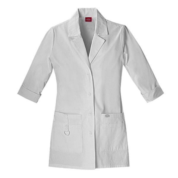 Dickies Women's White Contemporary Fit Lab Coat is jazzed up with a contemporary flair for you to instantly perk up your work silhouette. Back darts and back belt lend a feminine shape to this breathable cotton polyester blend coat. Notched collar and three-quarter sleeves with vent slits make it sporty and chic at the same time. Designed with four pockets to keep essential gear on-hand. Customize this lab coat to make it uniquely yours with an embroidered logo or a name in unique font for healthcare staff in your medical organization.Highlights