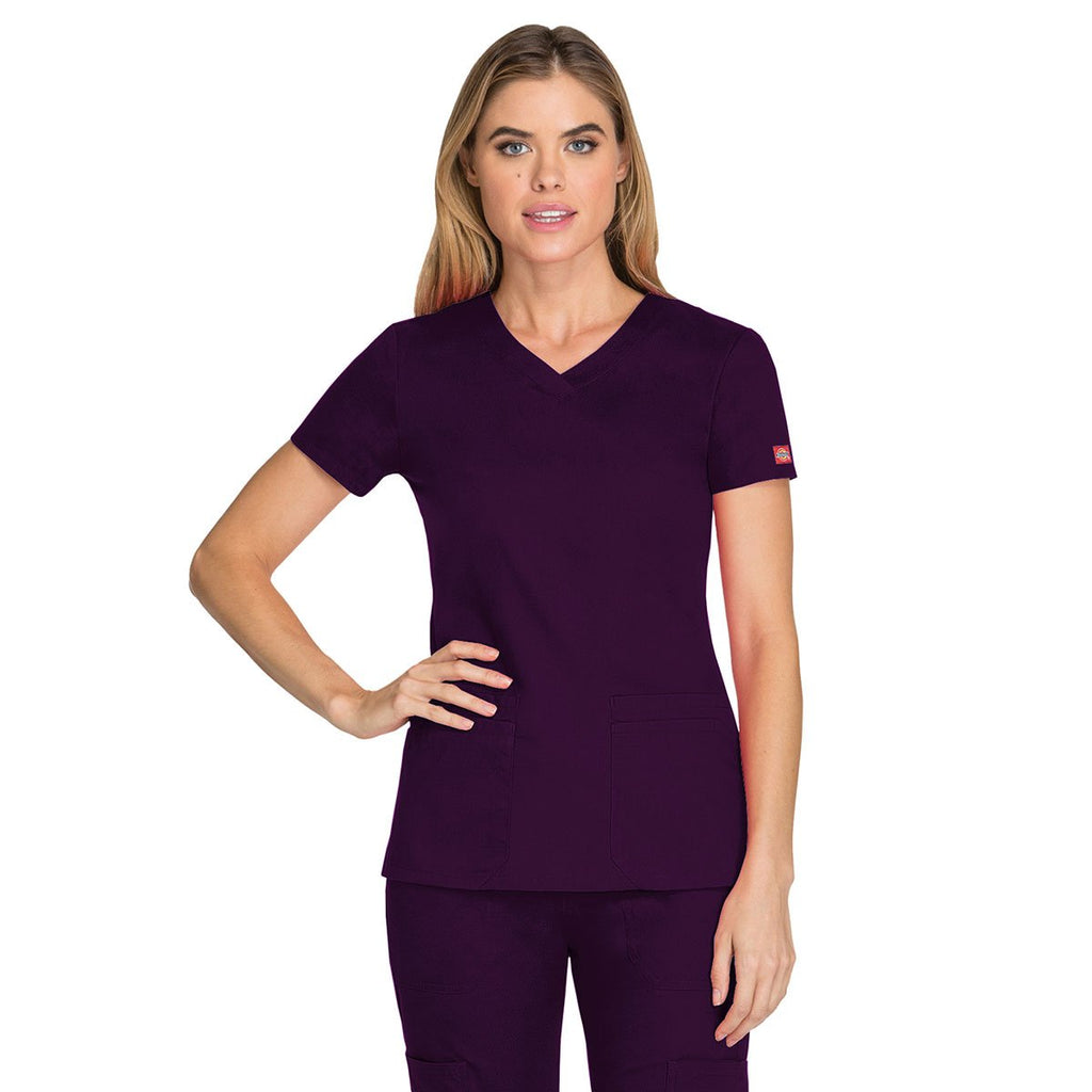 Enjoy the super soft comfort of brushed cotton every time you put on the logoed Dickies Women's Eggplant EDS Signature V-Neck Top. Cotton blends with tear resistant polyester to form a fabric that lasts you for several years under the bright lights of patient rooms and a hospital operating center. The stylish design of the v-neck top includes Dickies logo twill tape located at the back neck. You complement the Dickies logo by attaching an attractive custom logo on the large imprint area. Business logos help your company create more interest in your healthcare services.Highlights