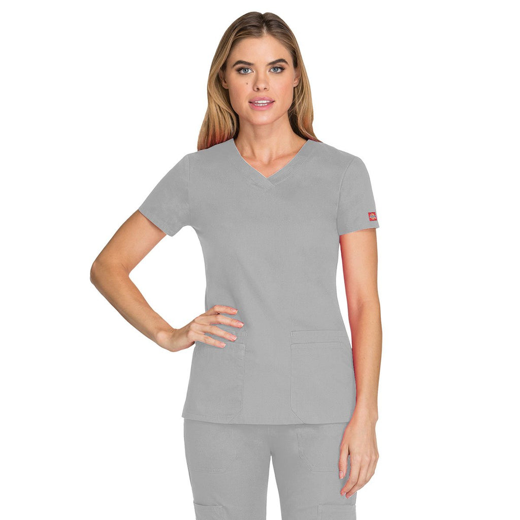 Enjoy the super soft comfort of brushed cotton every time you put on the logoed Dickies Women's Grey EDS Signature V-Neck Top. Cotton blends with tear resistant polyester to form a fabric that lasts you for several years under the bright lights of patient rooms and a hospital operating center. The stylish design of the v-neck top includes Dickies logo twill tape located at the back neck. You complement the Dickies logo by attaching an attractive custom logo on the large imprint area. Business logos help your company create more interest in your healthcare services.Highlights
