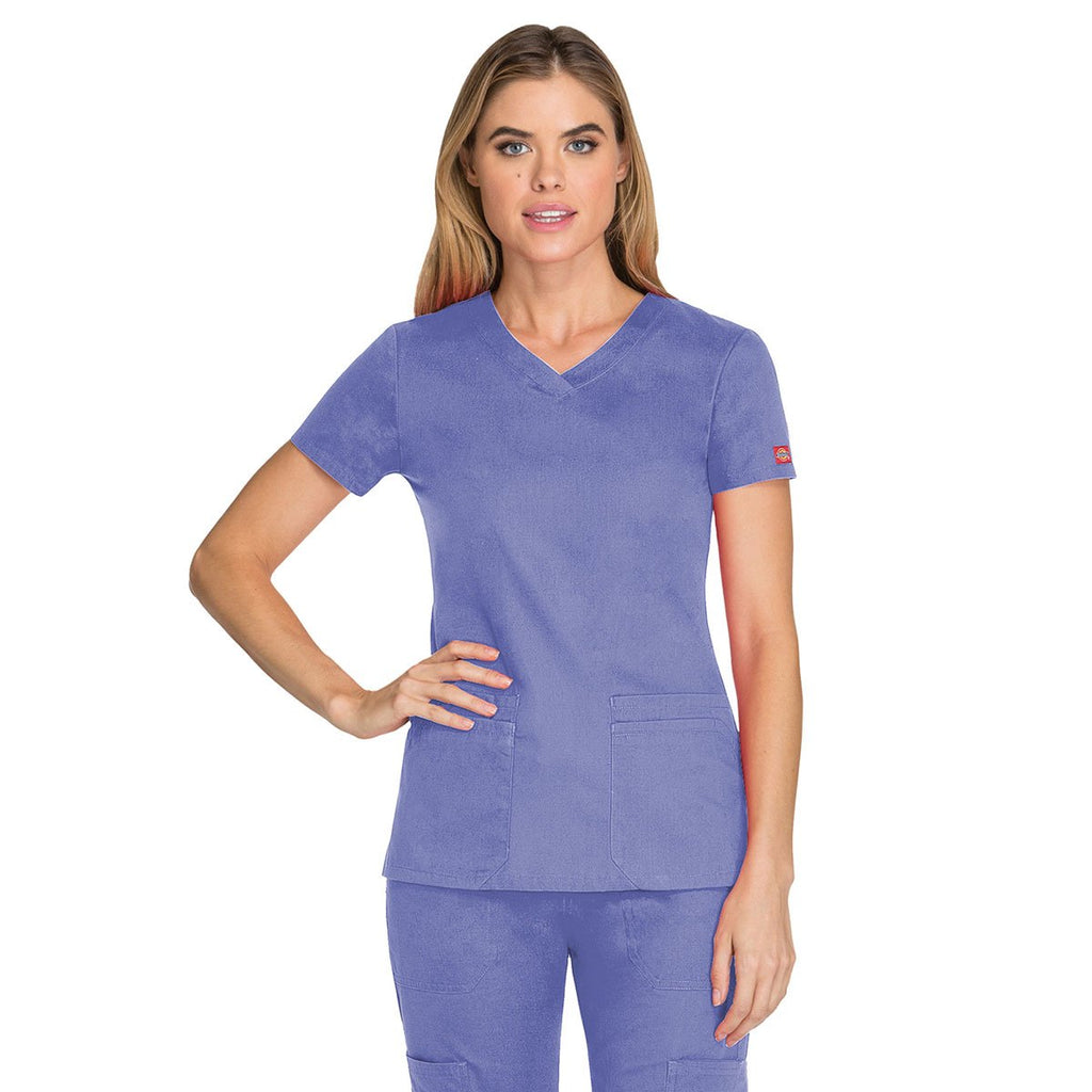 Enjoy the super soft comfort of brushed cotton every time you put on the logoed Dickies Women's Ciel EDS Signature V-Neck Top. Cotton blends with tear resistant polyester to form a fabric that lasts you for several years under the bright lights of patient rooms and a hospital operating center. The stylish design of the v-neck top includes Dickies logo twill tape located at the back neck. You complement the Dickies logo by attaching an attractive custom logo on the large imprint area. Business logos help your company create more interest in your healthcare services.Highlights