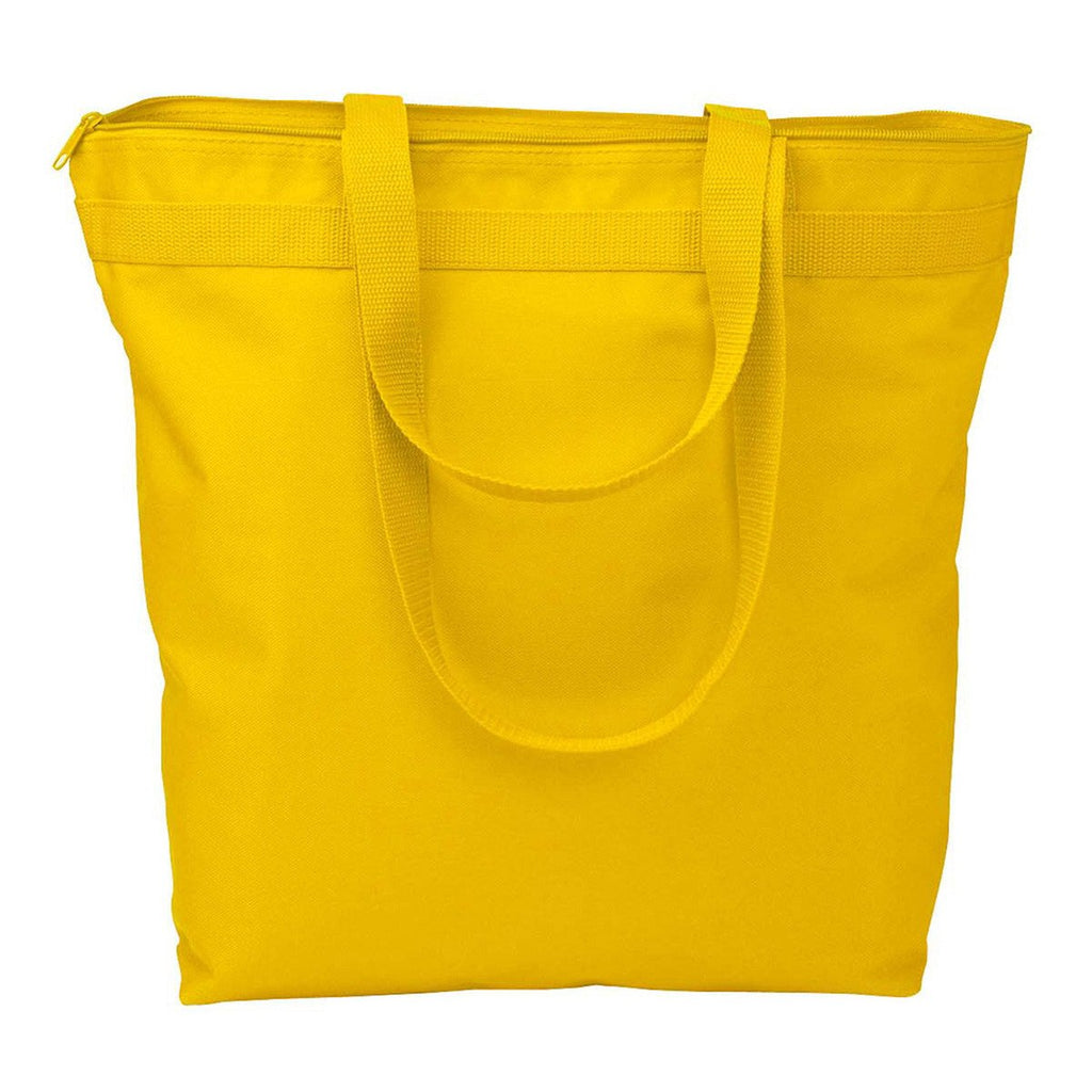 The minimum order for this product is 12 piecesDo you remember the last time you went grocery shopping and the paper bag holding your perishables ripped open on your way from leaving the empty cart by the store to the short walk to your car? The frustration of losing a dozen eggs and several bottles of soda put you on a mission to find a highly durable tote bag that handles the rigors of grocery and department store shopping. With a gusseted bottom, the UltraClub Bright Yellow Melody Large Tote bag offers protection against strong impacts made on the ground. The highly durable webbing reinforced top complements the polyester exterior that resists rips and tears. Add your corporate logo to enhance your company image at business seminars and conferences.