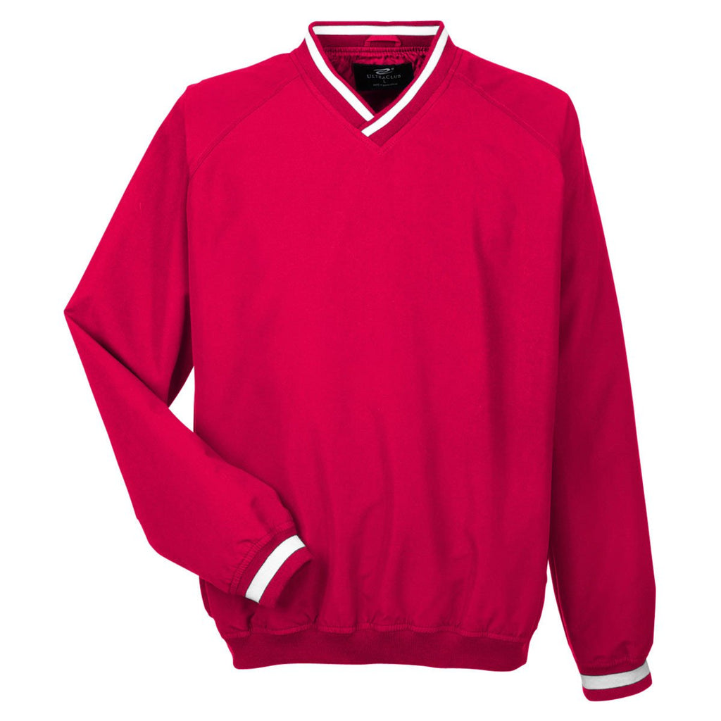 UltraClub Men's Red/White Long-Sleeve Microfiber Crossover V-Neck Windshirt
