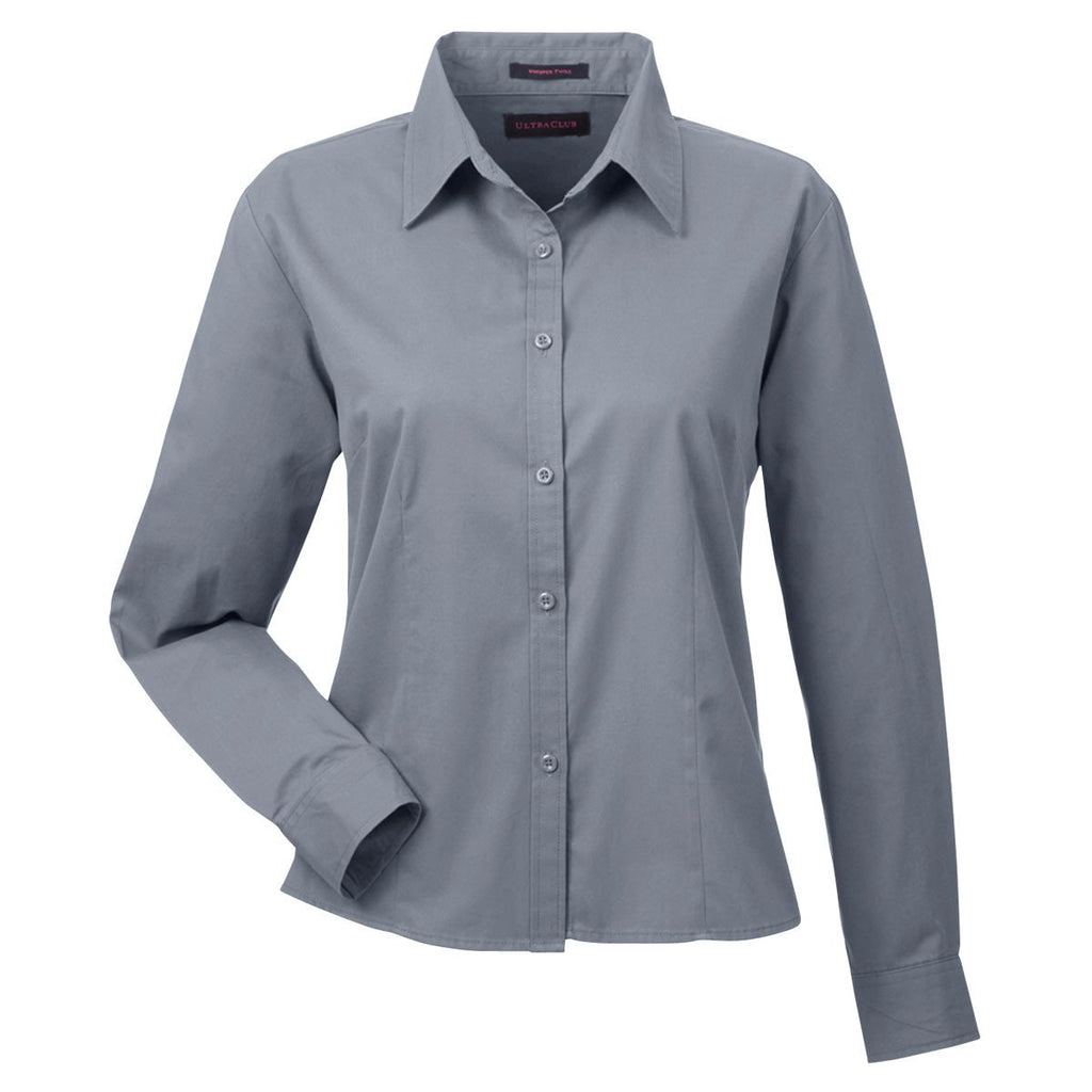 You do not have to whisper to keep the high-end fashion features quiet about the UltraClub Women's Graphite Whisper Twill. In fact, you should spread the word loudly by giving the sleek women's dress shirt to the female members of your successful team. Attach your corporate logo to the large imprint area for attracting more potential customers. The 55% cotton and 45% cotton twill dress shirt includes a peach finish that thickens the fabric fibers to create a lush appearance. Dyed-to-match buttons complement the refined design style of the spread collar to produce a corporate garment for all occasions.Corresponding Men's Style: UltraClub Men's Graphite Whisper Twill