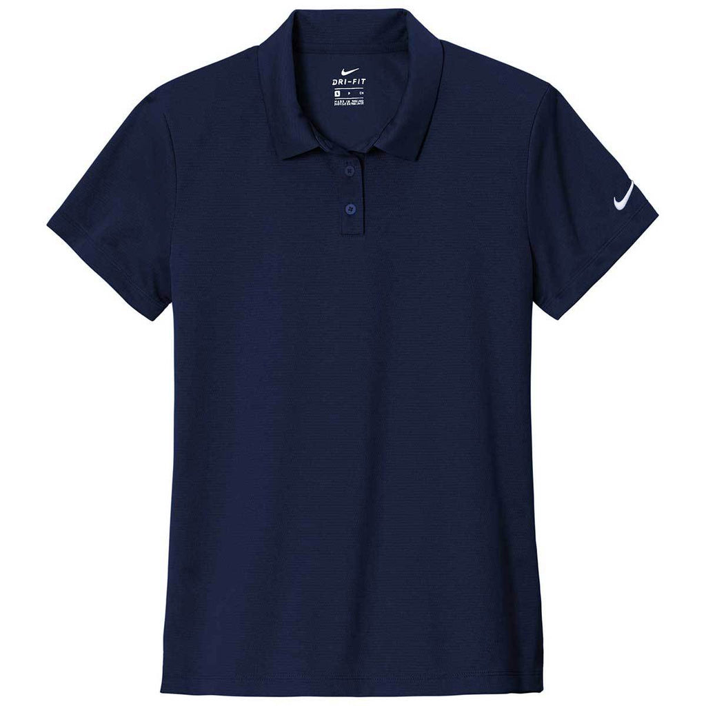 Head to the office or enjoy a round of golf in an embroidered Nike Women's Midnight Navy Dry Essential Solid Polo. The beautifully made classic polo can be used for anything from a company uniform to a solid choice for a corporate event with an embroidered custom logo. This must have polo provides Dri-FIT moisture management technology so your focus can remain on what you are doing rather than concern for sweat marks. The tailored feminine fit looks great with a custom design. Place an order today to use these as employee or end of the year gifts for all the people you know.Corresponding Men's Style:Nike Men's Midnight Navy Dry Essential Solid Polo