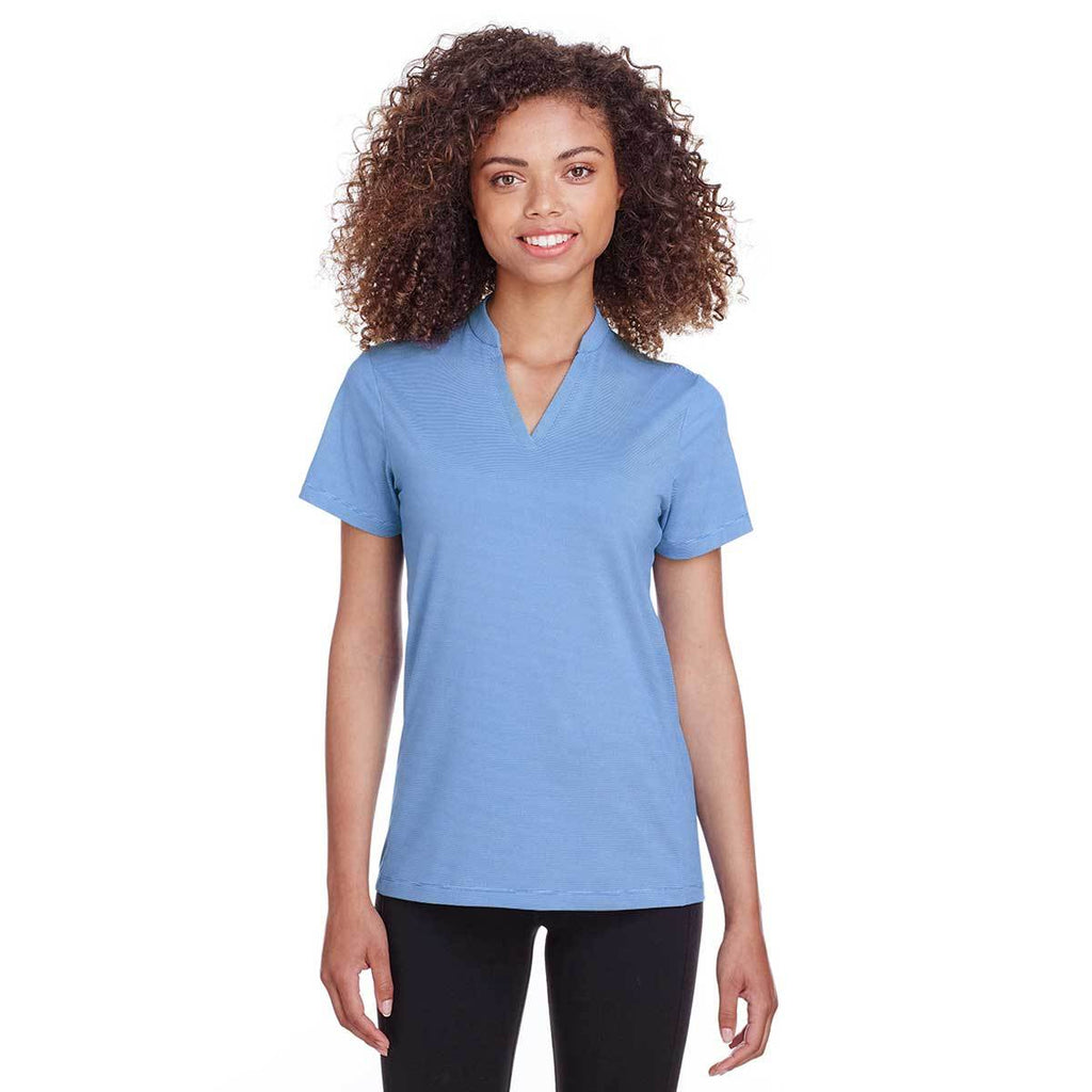 Outdoor wear that is simplistic, yet beautiful is found in the Spyder Women's Royal Stripe Boundary Polo. The midweight polyester and spandex jersey blend is comfortable enough to wear on the golf course, yet crisp enough to custom embroider and use as part of a company uniform. The slightly open v-neck style and short sleeves make this a great option for almost any activity that you wish to undertake, including team events. The short sleeve design is ideal for layering to make sure you are comfortable all day and will carry a company emblem with pride whether enjoying a day at the park or working a full shift. Place an order today with the custom embroidered design of your choosing.Corresponding Men's Style: Spyder Men's Royal Stripe Boundary Polo