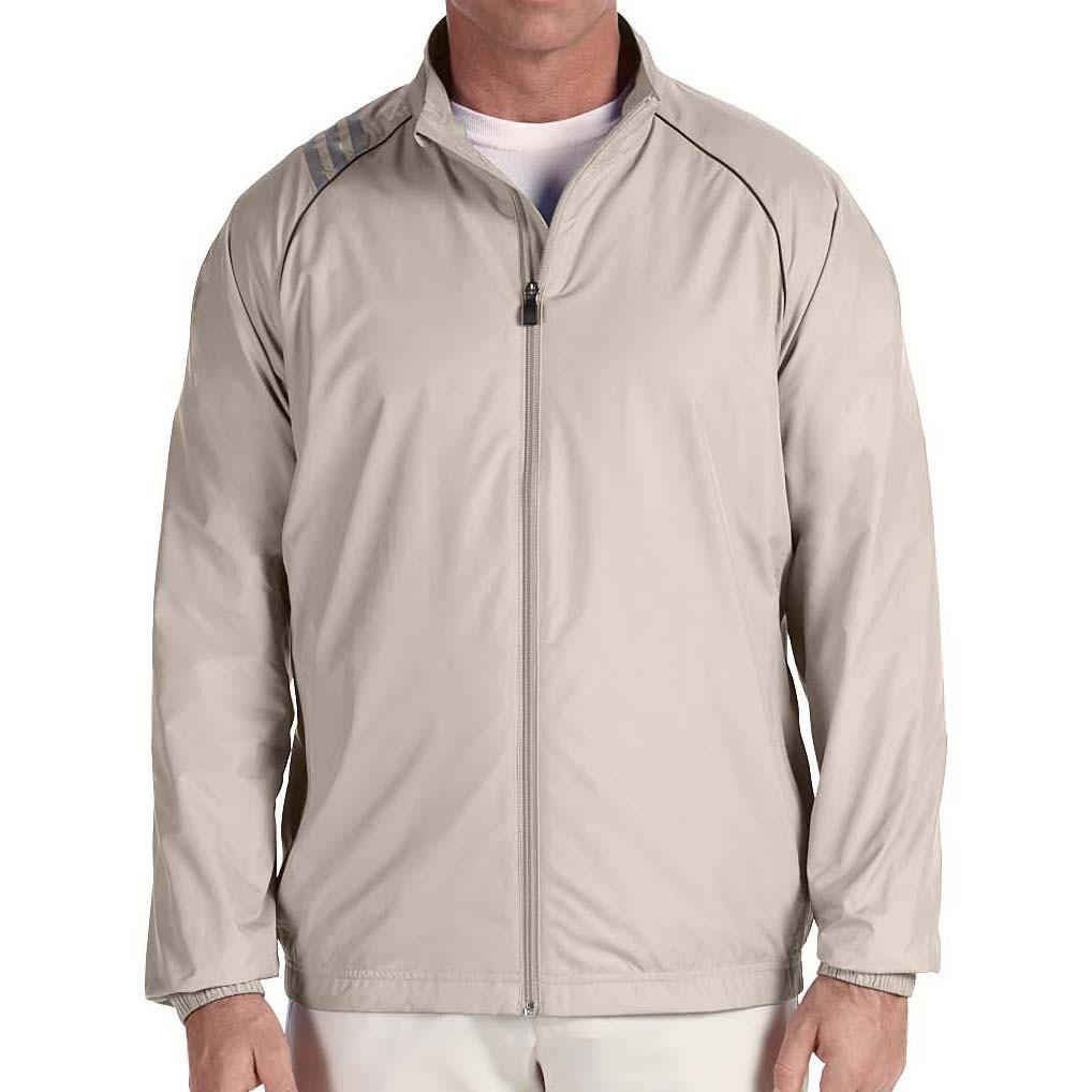 This jacket is for those serious golfers, the ones who refuse to acknowledge rain forecasts and refuse to be a pawn of the weatherman. The adidas Golf Men's Ecru 3-Stripes Full-Zip Jacket offers full weather protection, resisting both wind and water, while not neglecting your neck with its full zip feature. Raglan sleeves with contrast piping keep them in place without stifling your golf swing, while the back bottom elastic waistband ensures a proper fit-again, without stifling the swing. After all, weather protection is important, but no single article of clothing should ever get in the way of your drive.Highlights