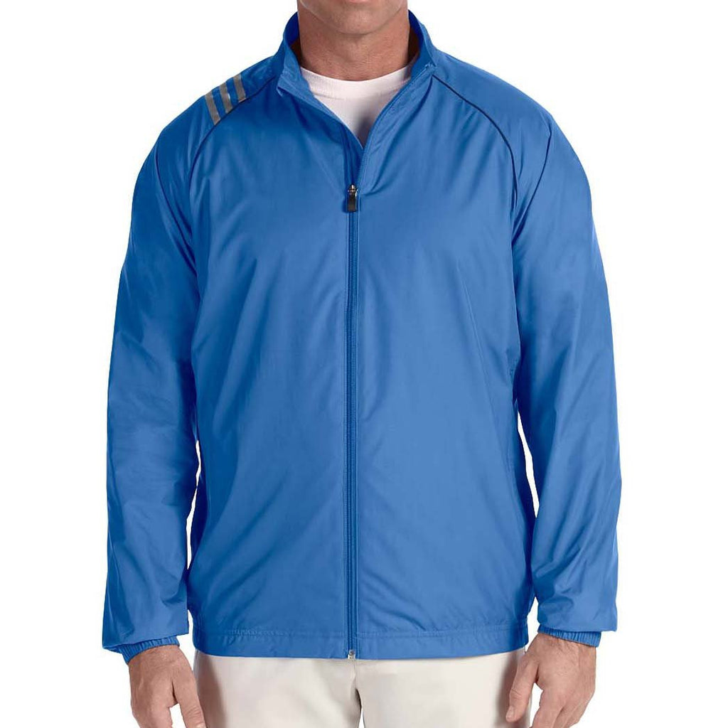 This jacket is for those serious golfers, the ones who refuse to acknowledge rain forecasts and refuse to be a pawn of the weatherman. The adidas Golf Men's Gulf Blue 3-Stripes Full-Zip Jacket offers full weather protection, resisting both wind and water, while not neglecting your neck with its full zip feature. Raglan sleeves with contrast piping keep them in place without stifling your golf swing, while the back bottom elastic waistband ensures a proper fit-again, without stifling the swing. After all, weather protection is important, but no single article of clothing should ever get in the way of your drive.Highlights