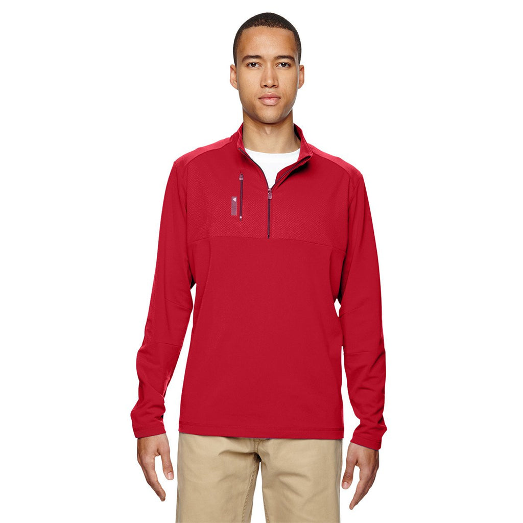 Want a shirt you can wear just about anywhere including the golf course? Then only a quarter-zip pullover-style shirt will suffice. Specifically, we're talking about this adidas Golf Men's Red Puremotion Mixed Media Quarter-Zip. Not only is it comfortable enough to wear just about anywhere you go, but it's stylish enough to fit in, what with its right chest zipper pocket, its banded cuff and bottom hem, and the self mock collar. Mostly polyester fabric ensures a breathable, lightweight durability that's hard to get from other fabrics. All it's missing is the additional element of your own company's brand right on the front.Highlights