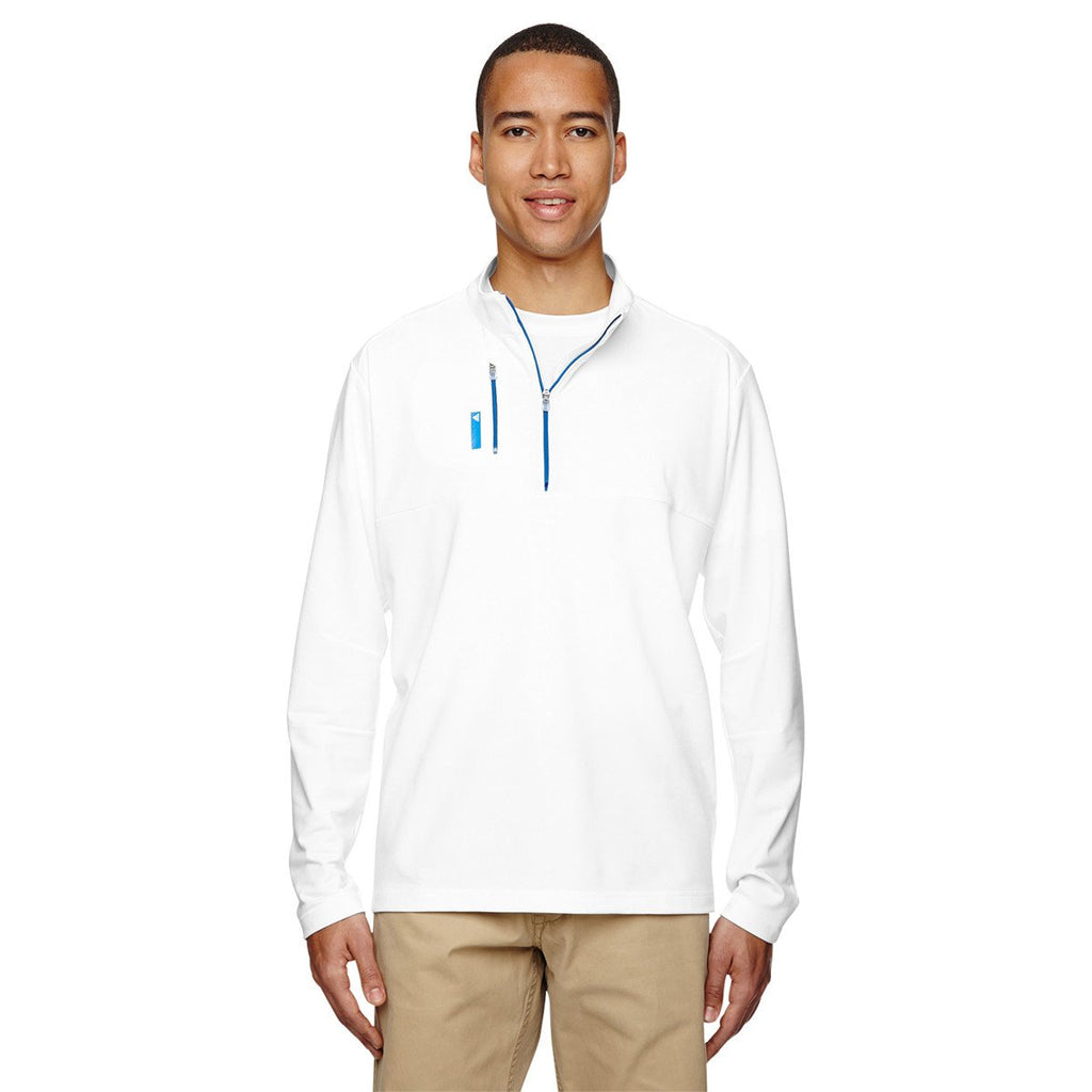 Want a shirt you can wear just about anywhere including the golf course? Then only a quarter-zip pullover-style shirt will suffice. Specifically, we're talking about this adidas Golf Men's White/Royal Puremotion Mixed Media Quarter-Zip. Not only is it comfortable enough to wear just about anywhere you go, but it's stylish enough to fit in, what with its right chest zipper pocket, its banded cuff and bottom hem, and the self mock collar. Mostly polyester fabric ensures a breathable, lightweight durability that's hard to get from other fabrics. All it's missing is the additional element of your own company's brand right on the front.Highlights
