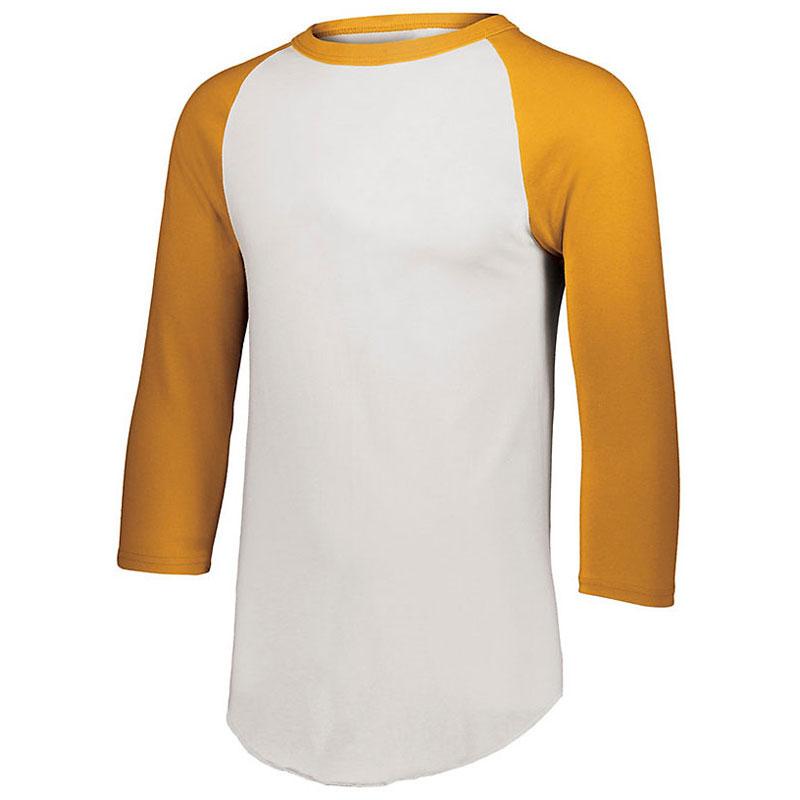 The custom Augusta Sportswear Men's White/Gold 3/4-Sleeve Baseball Jersey comes in 16 different colors, ideal for finding the perfect color tone to complement your company logo. This 3/4-length sleeve shirt is made of a comfortable 50/50 cotton/polyester jersey knit fabric and consists of enticing additional features, such as a contrast color rib knit collar, tear away label, contrast color sleeves, double-needle hem sleeves, fishtail bottom, and more. Add your screen print company logo and purchase this corporate apparel for your company softball team or as a gift to employees for a job well done at the office.Highlights