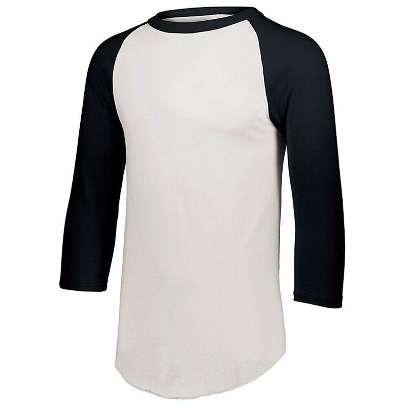 The custom Augusta Sportswear Men's White/Black 3/4-Sleeve Baseball Jersey comes in 16 different colors, ideal for finding the perfect color tone to complement your company logo. This 3/4-length sleeve shirt is made of a comfortable 50/50 cotton/polyester jersey knit fabric and consists of enticing additional features, such as a contrast color rib knit collar, tear away label, contrast color sleeves, double-needle hem sleeves, fishtail bottom, and more. Add your screen print company logo and purchase this corporate apparel for your company softball team or as a gift to employees for a job well done at the office.Highlights