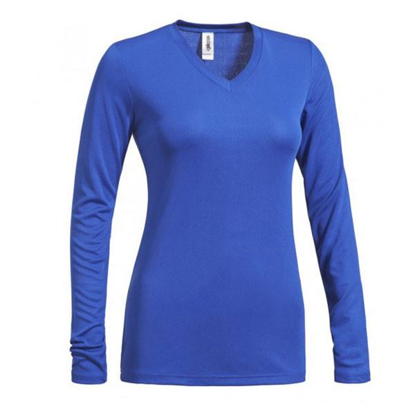Expert Women's Royal V-Neck Long Sleeve Tee is a superb summer activewear essential. Its classic v-cut neckline adds to cool athletic style and makes for superior breathability. It's breathable and super-comfortable and wicks away sweat cooling you down during cardio or Zumba, and its stretchiness allows you to easily move around. Crafted from 100% microfiber polyester pk maX. Suitable for any sport, this full-sleeve women's t-shirt is customizable with your company's logo for corporate branding or giveaway swag.Highlights