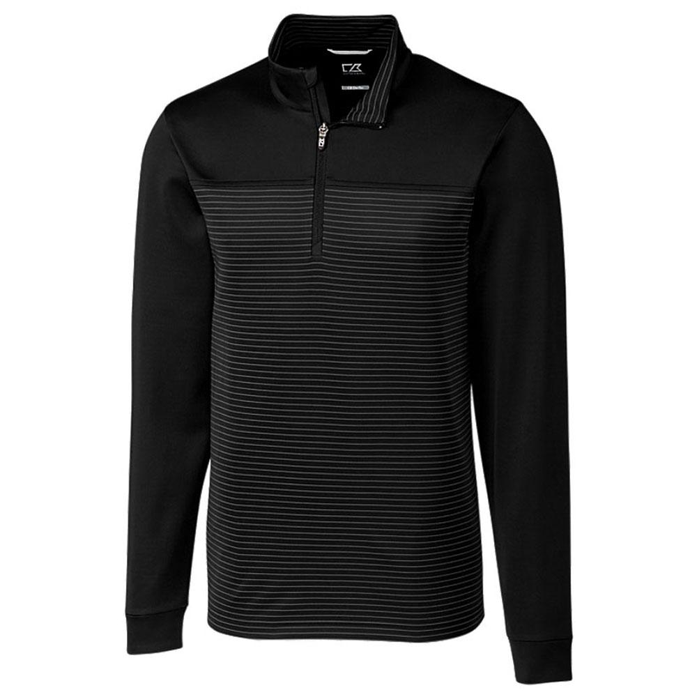 Enjoy the classic look of this Cutter & Buck Men's Black Tall DryTec Traverse Stripe Half-Zip with the addition of your custom logo. The top has a solid color look that offers enough room for a corporate logo for a personalized athleisure outfit that you can give away to workers during a special event. The bottom part includes a densely layered look with a series of small white stripes all around. The polyester and spandex designs include a double knit fabric feature that includes comfortable patterns for allowing air to move along well. The solid surfaces around the sleeves and collar add a sturdy design for use during the fall and winter seasons.Highlights