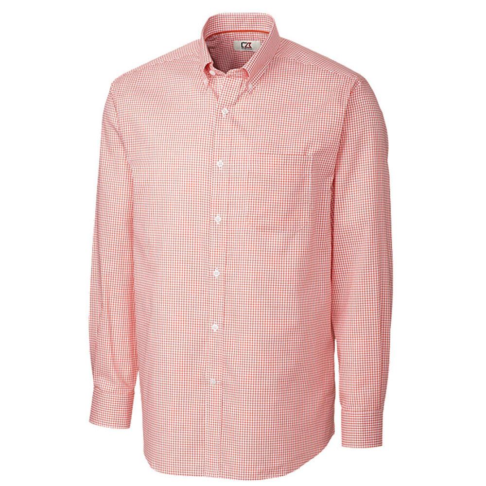 View the attractive look of the Cutter & Buck Men's College Orange Tall Long Sleeve Epic Easy Care Tattersall Shirt for yourself and see how this outfit fits in well with many company uniform standards. The tattersall style comes with a button-down collar and a brilliant layout featuring thick lines intertwined with each other on the main body. The barrel cuffs add a good touch to the outfit. The smooth design of the plain weave adds a good touch to wear as well, thus producing a body you will want to sport anywhere you go. This is comfortable for many outfits and is nice to wear under a jacket at any formal outing.Highlights