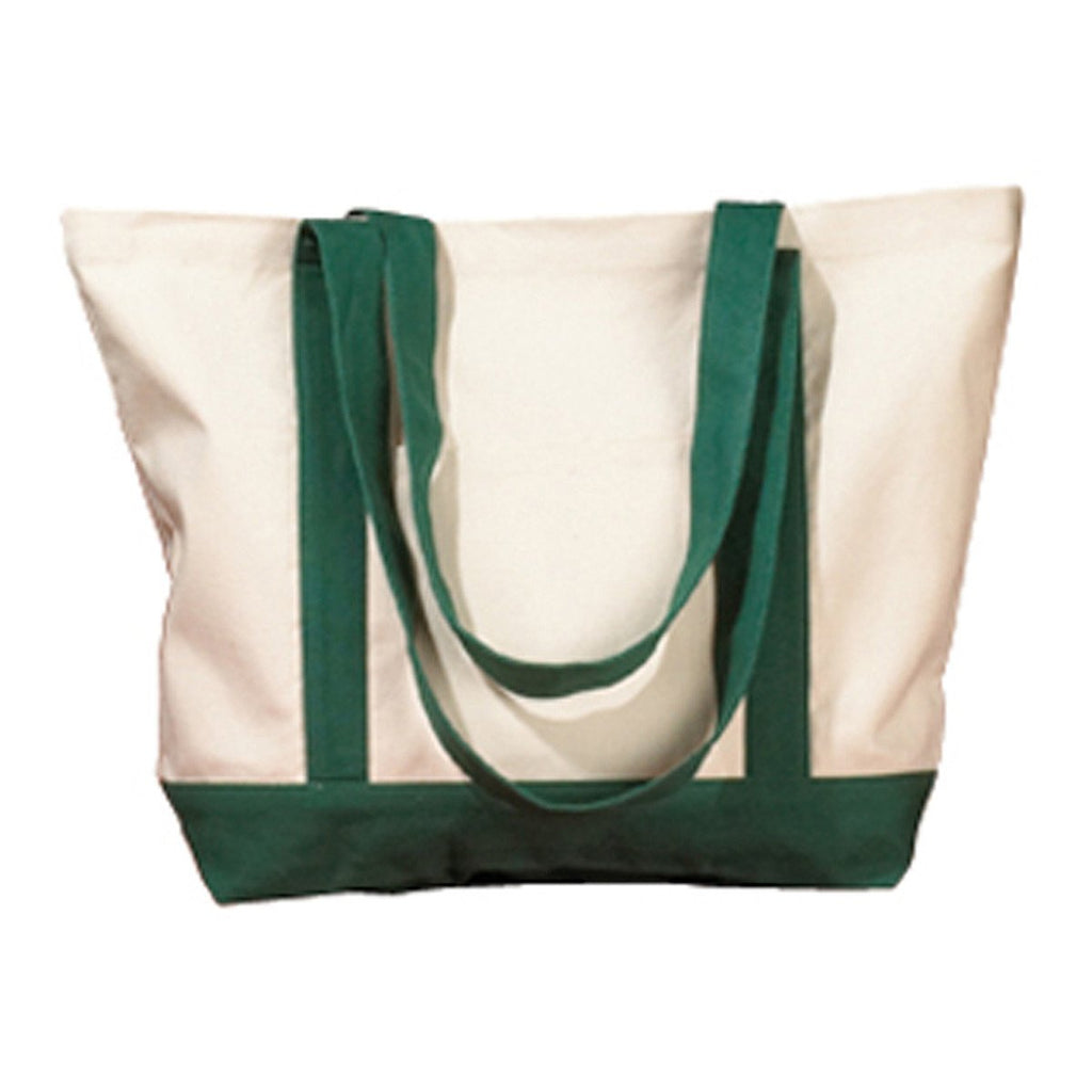 You might not think that a 100% cotton tote bag can handle the punishment inflicted on it at crowded markets. The 100% cotton BAGedge Natural/Forest 12 oz Canvas Boat Tote bag resists the types of rips and tears that render other brand tote bags obsolete. Long carrying handles allow you to balance heavy loads against your hip to give you more movement flexibility in tight grocery store aisle. Place the tote on your right shoulder to grab a carton of milk out of the refrigeration unit and then quickly move the tote bag to the left shoulder to allow a customer to pass you by. Add a custom logo to promote your business to potential customers that shop at the same grocery and department stores.