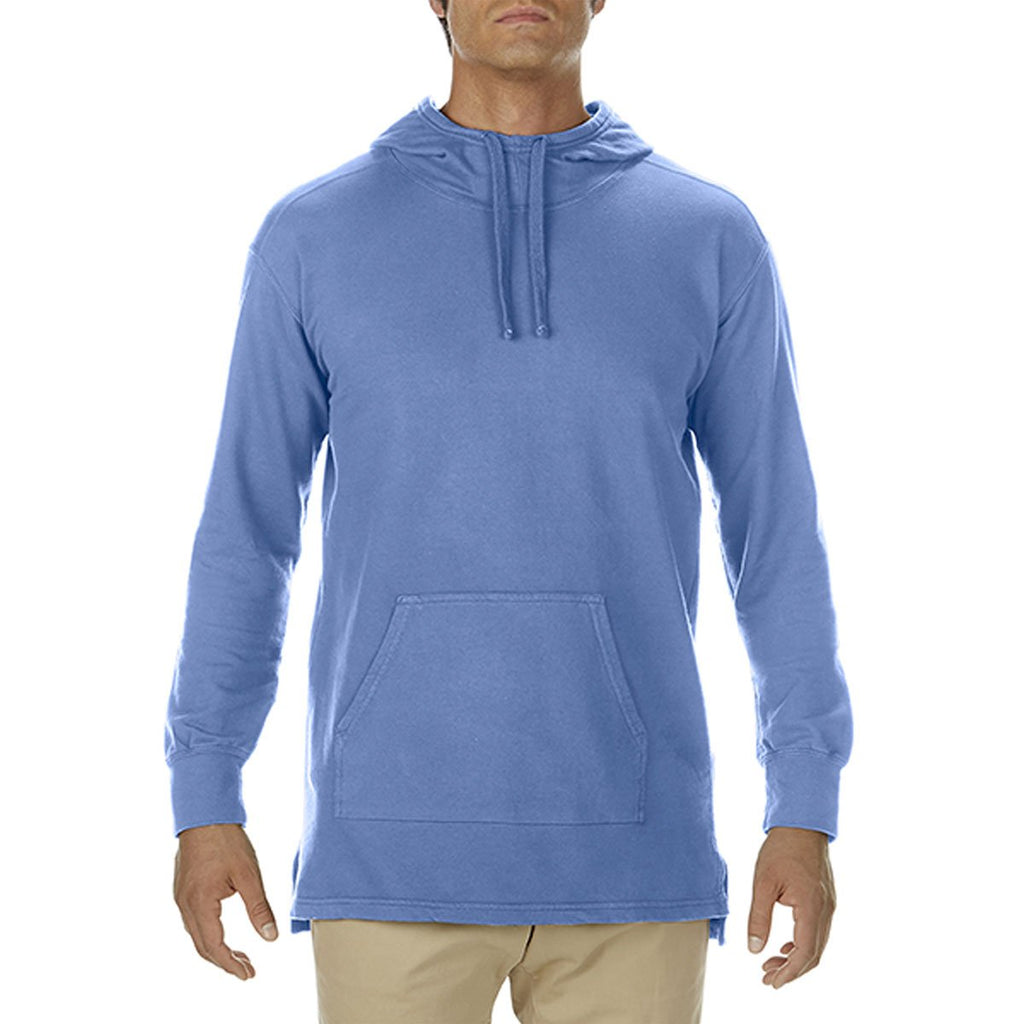 Order the embroidered Comfort Colors Men's Flo Blue French Terry Scuba Hood to wear at the next industry trade show. In fact, make sure everyone helping you at the big event wears the chic shirt. Add your company logo on the large imprint area to let visitors to your booth know your brand delivers on its promise of offering only quality products and services. The soft washed garment dyed fabric exudes panache. Smooth 100% ring spun cotton gently caresses the skin to keep you charging forward all day long. Wear the hooded long sleeve shirt as a stand-alone garment to layer it underneath a heavier pullover hoodie.Highlights
