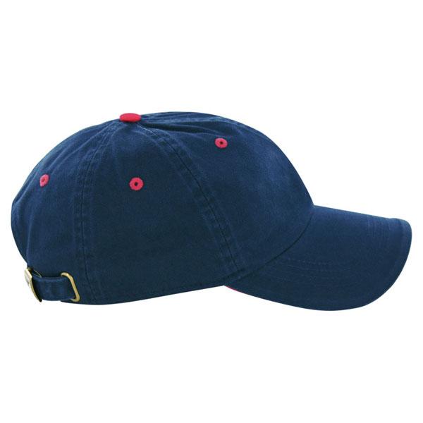 If you are planning a gift for your loyal employees or maybe for company promotions, the AHEAD Navy/Red Classic Cut Sandwich Brim Cap with custom logo on it is always a good choice. This classic cap is always in, and goes with sportswear as well as casual wardrobe. This is why your employees will wear this cap with your corporate logo on during their everyday activities. This cap has classic cut made of vintage twill and its elegant look goes with most styles. It has a cloth strap with metal grab on back. Sandwich indentation is a different color than the cap, so you can choose between almost twenty color combinations and find one that goes best with your company.