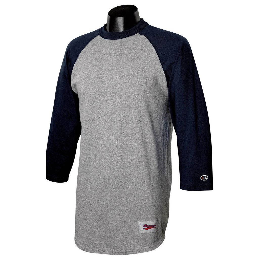 Want a T-shirt that will never go out of style? The classic design of the Champion Men's Grey/Navy Baseball T-Shirt is comfortable and durable enough to wear all the time--and casual enough that you just might get away with doing exactly that. The Champion Men's Grey/Navy Baseball T-Shirt is extremely lightweight and breathable.?Made with 100% cotton, it has 3/4 length sleeves, double-needle stitching on the sleeves and bottom hem, and a logo on the left sleeve.Highlights