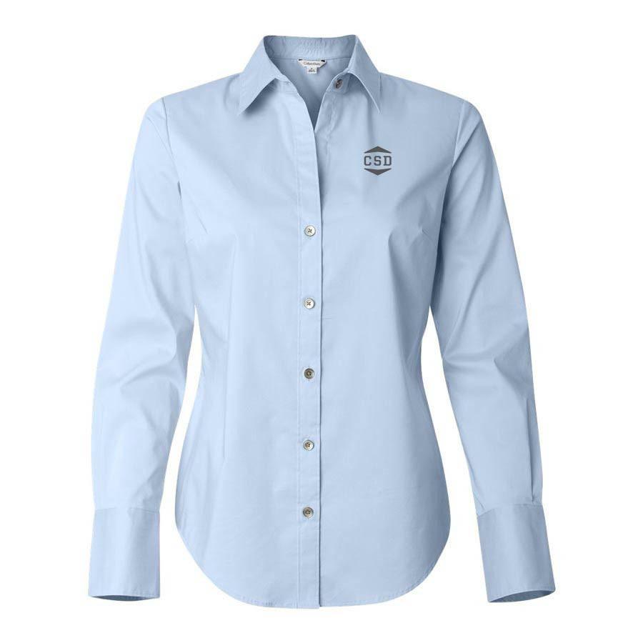 It has many wonderful features such as a sewn on center placket, classic spread collar, and double button barrel cuffs. In addition, the Calvin Klein Women's Stream Blue Cotton Stretch Solid Dress Shirt has a feminine silhouette which contours the body beautifully. It is made of a cotton/polyester/spandex blend. Place your corporate logo on the chest or cuff.70% cotton/27% polyester/3% spandex.