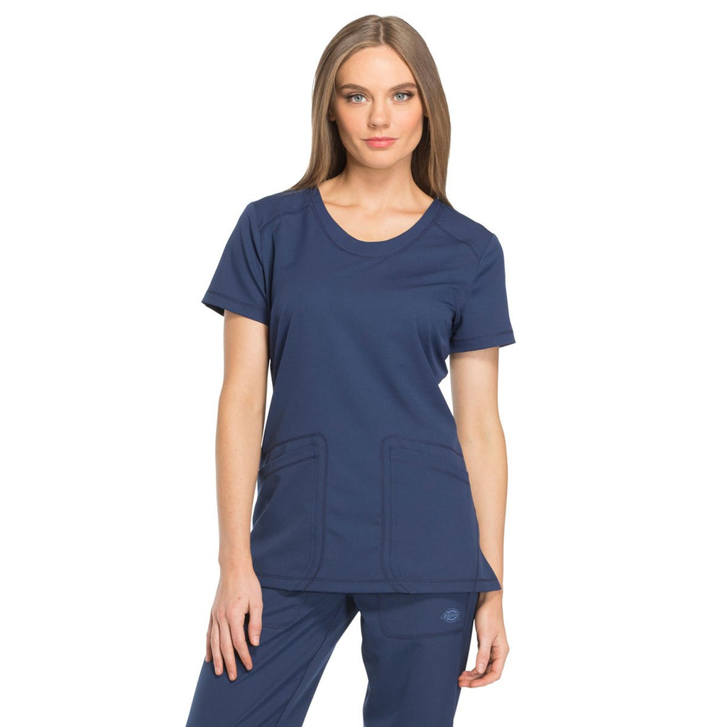 With a rounded v-neck top, the logoed Dickies Women's Navy Dynamix Rounded V-Neck Top makes a stylish fashion statement, without sacrificing the legendary durability associated with the Dickies brand. More than 90% polyester fabric resists rips and tears to make the v-neck top ideal for wearing physically demanding work projects. For healthcare workers, the versatile corporate apparel offers supreme comfort throughout every long shift. Front and back yokes provide support for the soft, looser fabric sections. Attach your corporate logo to boost the image of your company in the community.Highlights