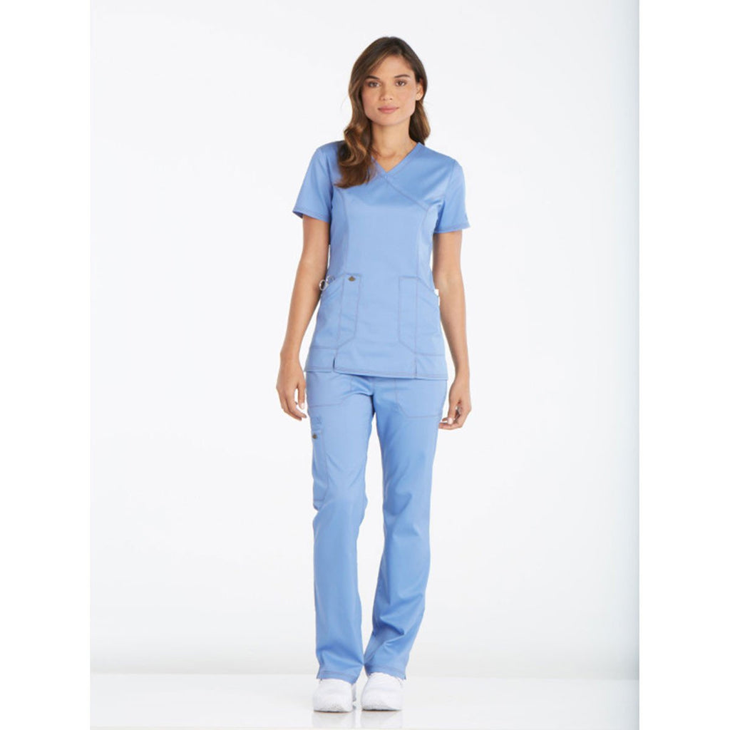 Stay cool and comfortable throughout your shift in Dickies Women's Ceil Essence Mock Wrap Top crafted from stretchy polyester blend fabric. Enhanced with Dickies logo, topstitching, and side vents. V-neckline, asymmetrical patch pockets, a scissor pocket with grommet and utility loops, and a contemporary fit enliven this mock wrap top. Make this scrub top distinctively yours by adding an embroidered logo or font with our quick and affordable customization service. Ideal for hospitals, healthcare centers, dental offices, medical response teams.Highlights