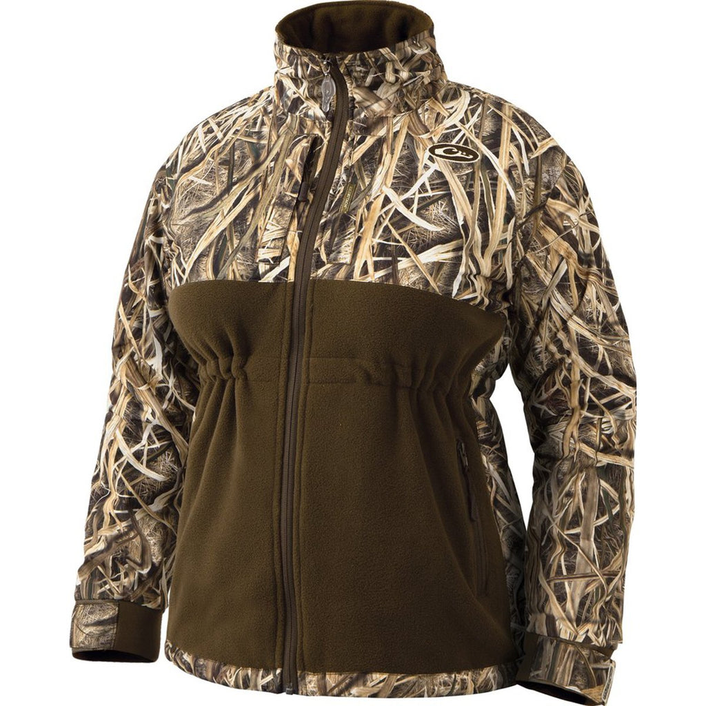 Trademarked Refuge HS fabric covering the embroidered Drake Waterfowl Women's Mossy Oak Blades Eqwader Plus Full Zip protects you against the worst weather conditions. Neither gusty winds nor torrential rain can put a damper on your day of action packed hunting. One-hundred percent polyester fleece exudes softness to ensure you enjoy optimal comfort all day long. Wear the full zip during a morning fishing trip and keep the fashionable jacket on during lunch with your friends. Adjust the draw string along the waist to find the best fit. Add a custom logo on the large imprint area to reach more customer prospects.Highlights