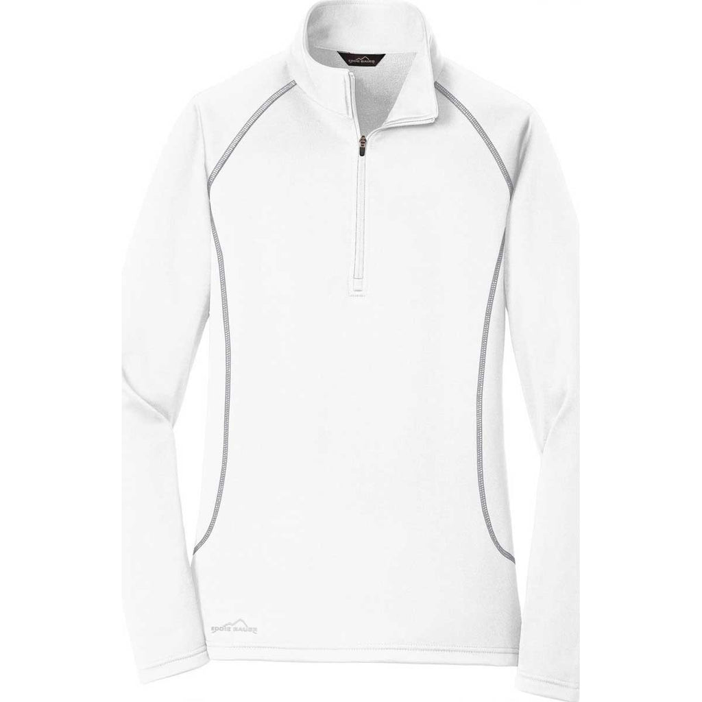 When the weather turns frightful, you want to wear layers of clothing to keep from the chill. As either an outer or a middle garment, the Eddie Bauer Women's White 1/2-Zip Base Layer Fleece also works as a solo fashion statement, as the 100% polyester fleece feels smooth against the skin. You can wear the fleece jacket outdoors or to after hour work engagements. Flat seam details enhance the appearance of an already sleek 1/2-zip fleece. Attach a custom logo to the large imprint area and hand out the base layer fleece jacket to loyal customers.Corresponding Men's Style:Eddie Bauer Men's White 1/2-Zip Base Layer Fleece
