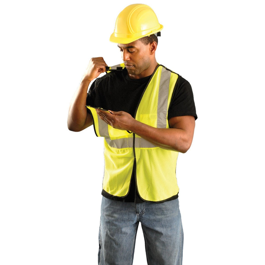 If you work outside at night, you need to wear a OccuNomix Men's Yellow High Visibility Value Mesh 5-pt. Break-Away Safety Vest that alerts motorists of your presence. designs and manufactures a line of safety vests that include two-inch wide high visibility reflective tape that motorists can see from several hundred feet away. Large openings allow you to wear the layering safety vest over heavy jackets during cold weather work projects. adds several easy to access pockets for storing important work-related tools, such as a tape measurer or a Phillips screwdriver. Highly breathable mesh keeps you comfortable on hot, humid summer days.Highlights